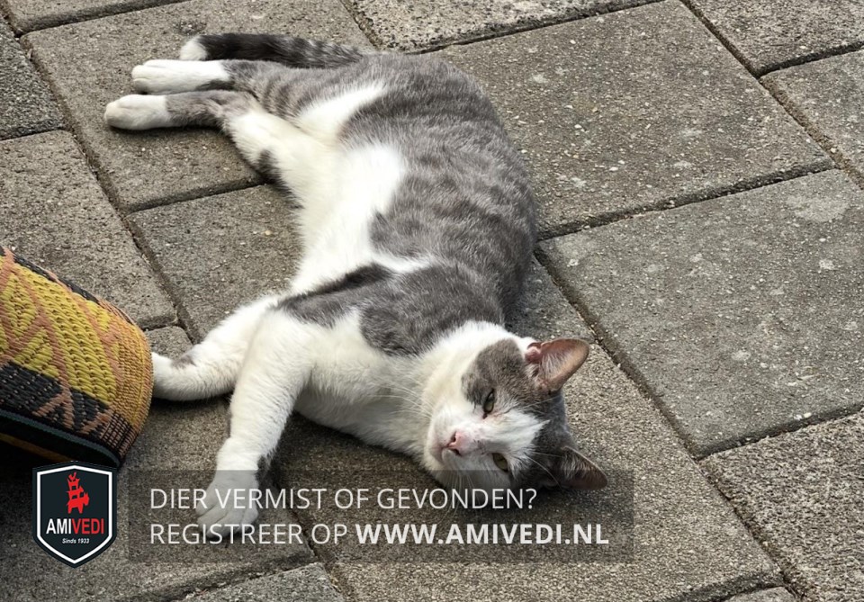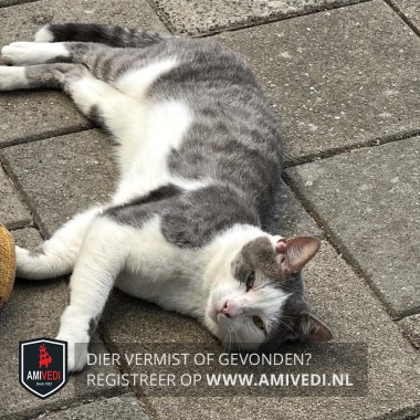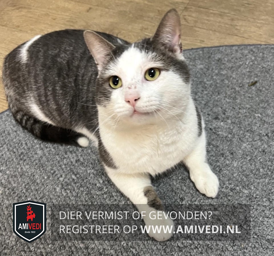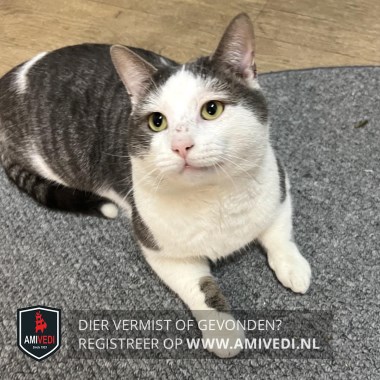| Signalement | Cypers grijs gestreept petje, rug, staart met een wit puntje, witte bles, bef, borst, witte voorpootjes, met aan de rechterkant een grijze vlek, achterste grijs gestreepte pootjes, met witte sokjes. |