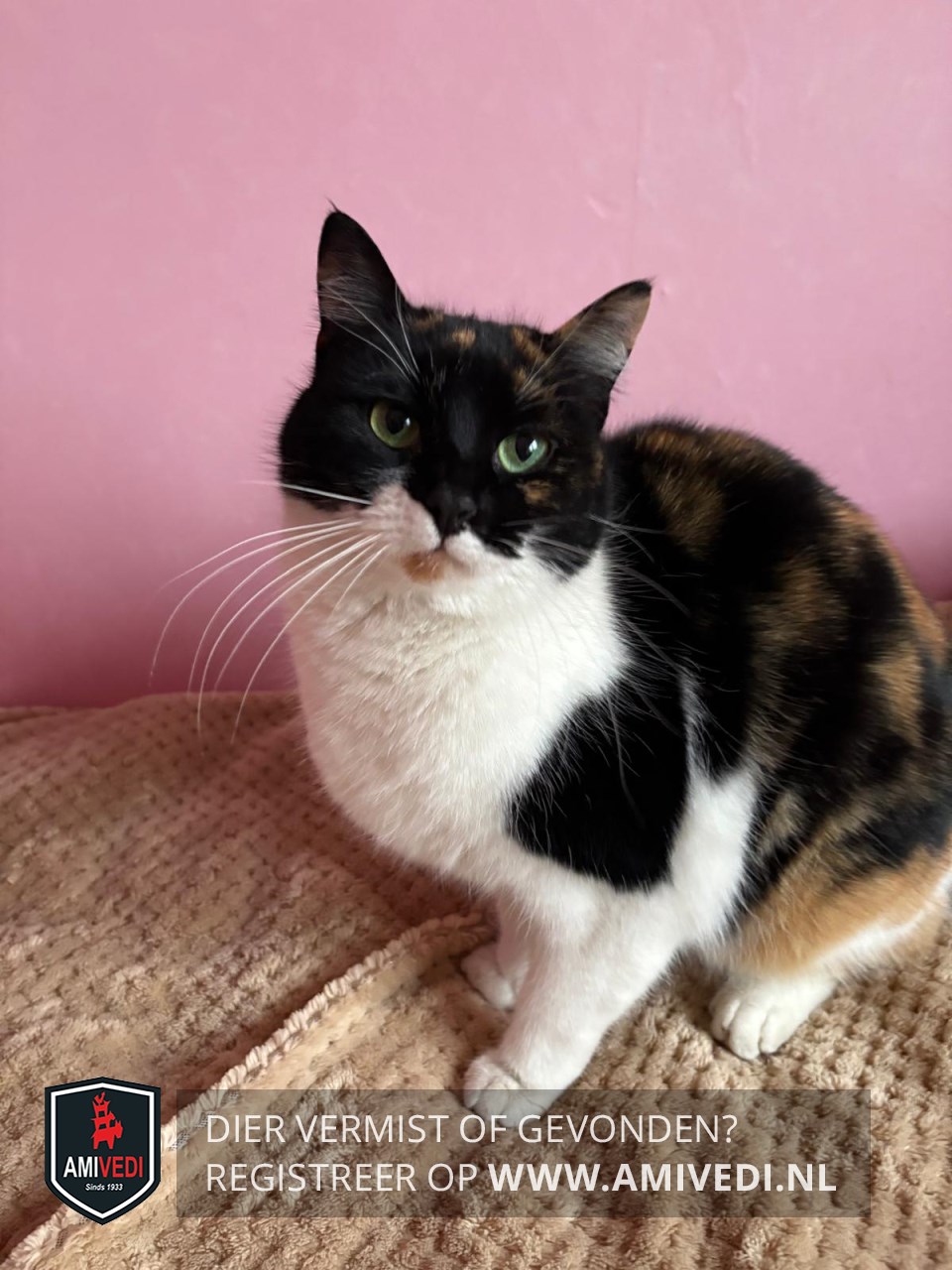| Signalement | Lapjespoes , zwarte oortjes en een zwarte bles, rode vlekken op het kopje en onder het oog een rood vlekje. Witte snuit en witte bef, witte pootjes en witte onderkant, volledig gevlekt lijfje. |