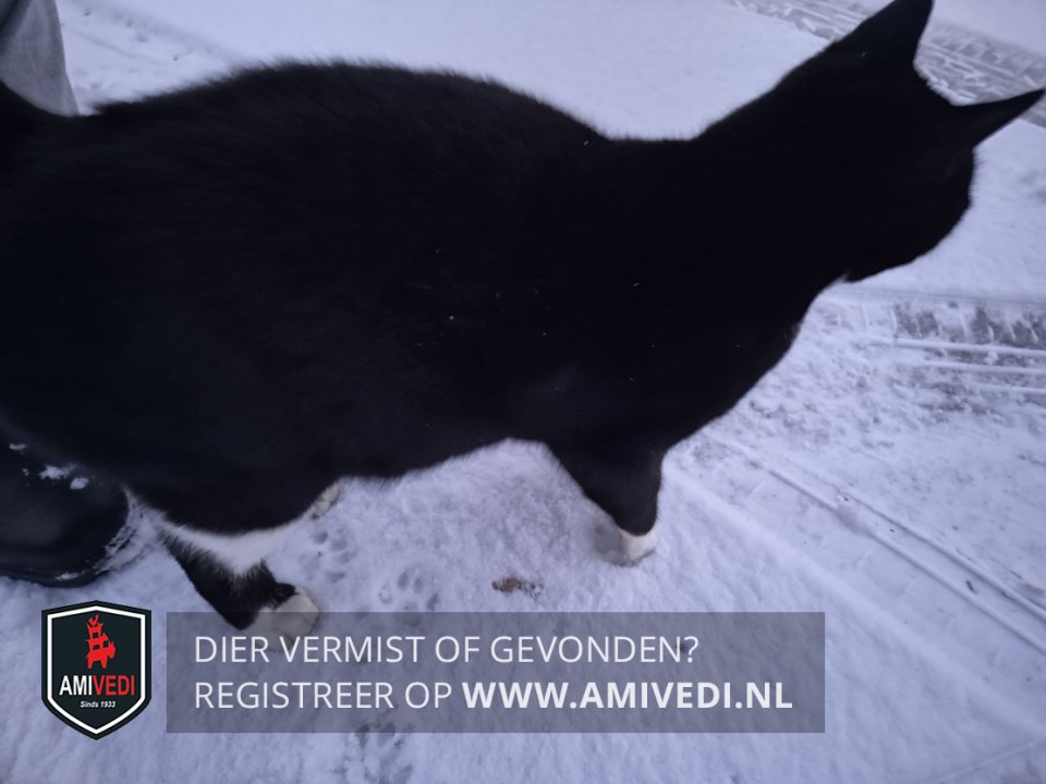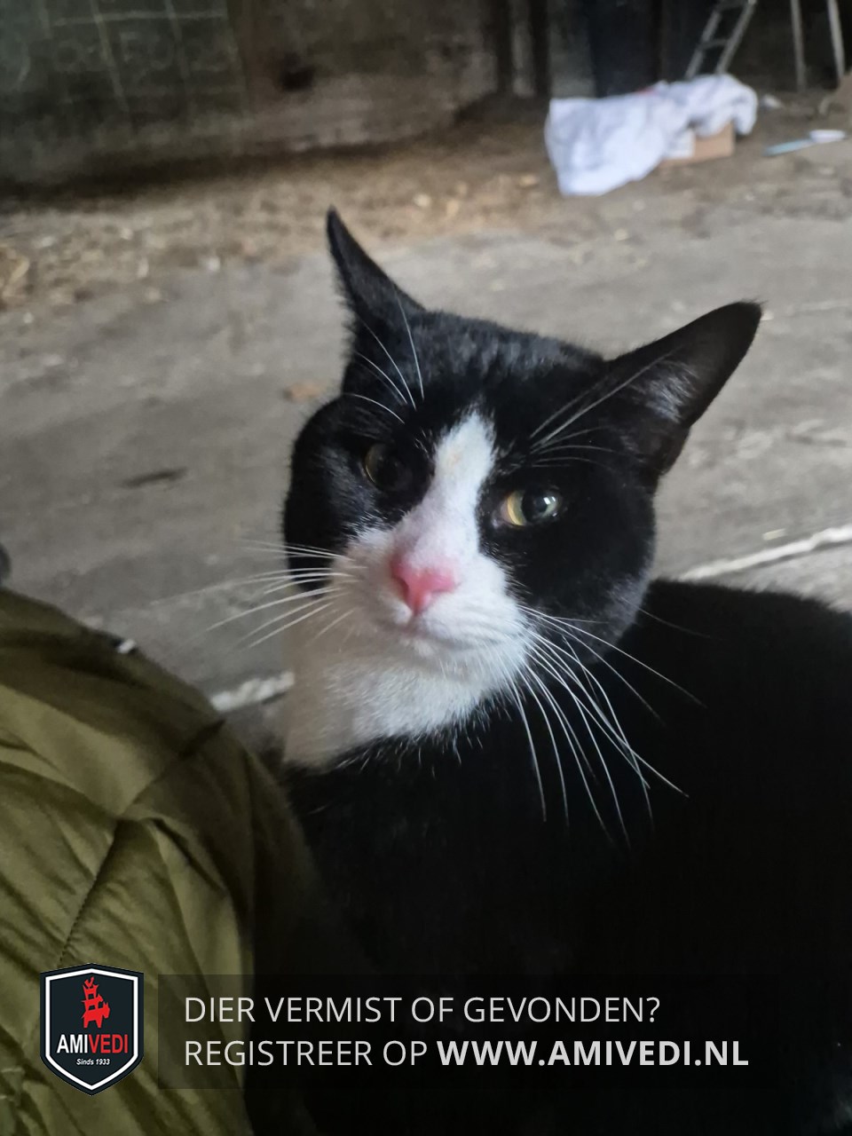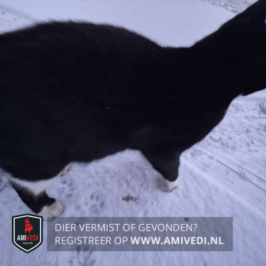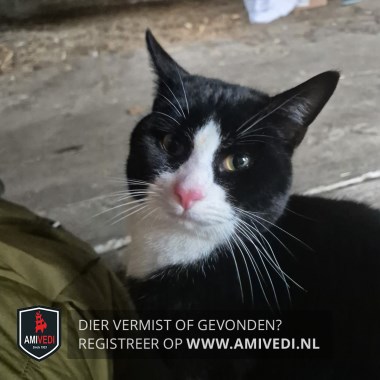 | Signalement | Zwarte kop, wit op de neusbrug, snuit, kin, bef, zwart lijf, voor en achter poten witte voetjes, op de rechter achter poot zit bovenin een witte vlek. |