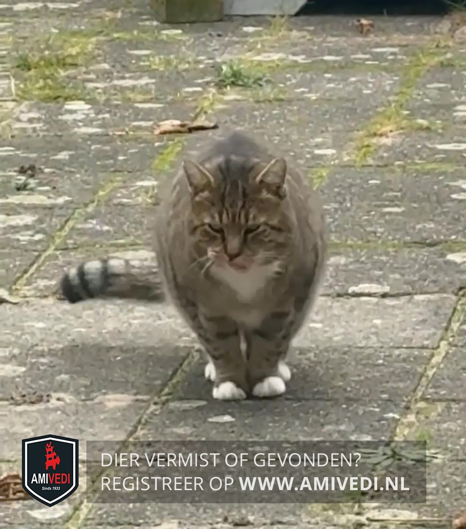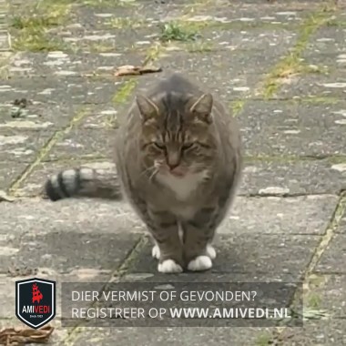 | Signalement | Cypers grijze kop M op het voorhoofd, witte bef, cypers grijs lijf, voorpoten zijn grijs met een identiek zwart streep patroon, met witte voetjes, achter poten witte sokjes, grijze staart met in de punt zwarte ringen en grijze punt, dik behaard. |