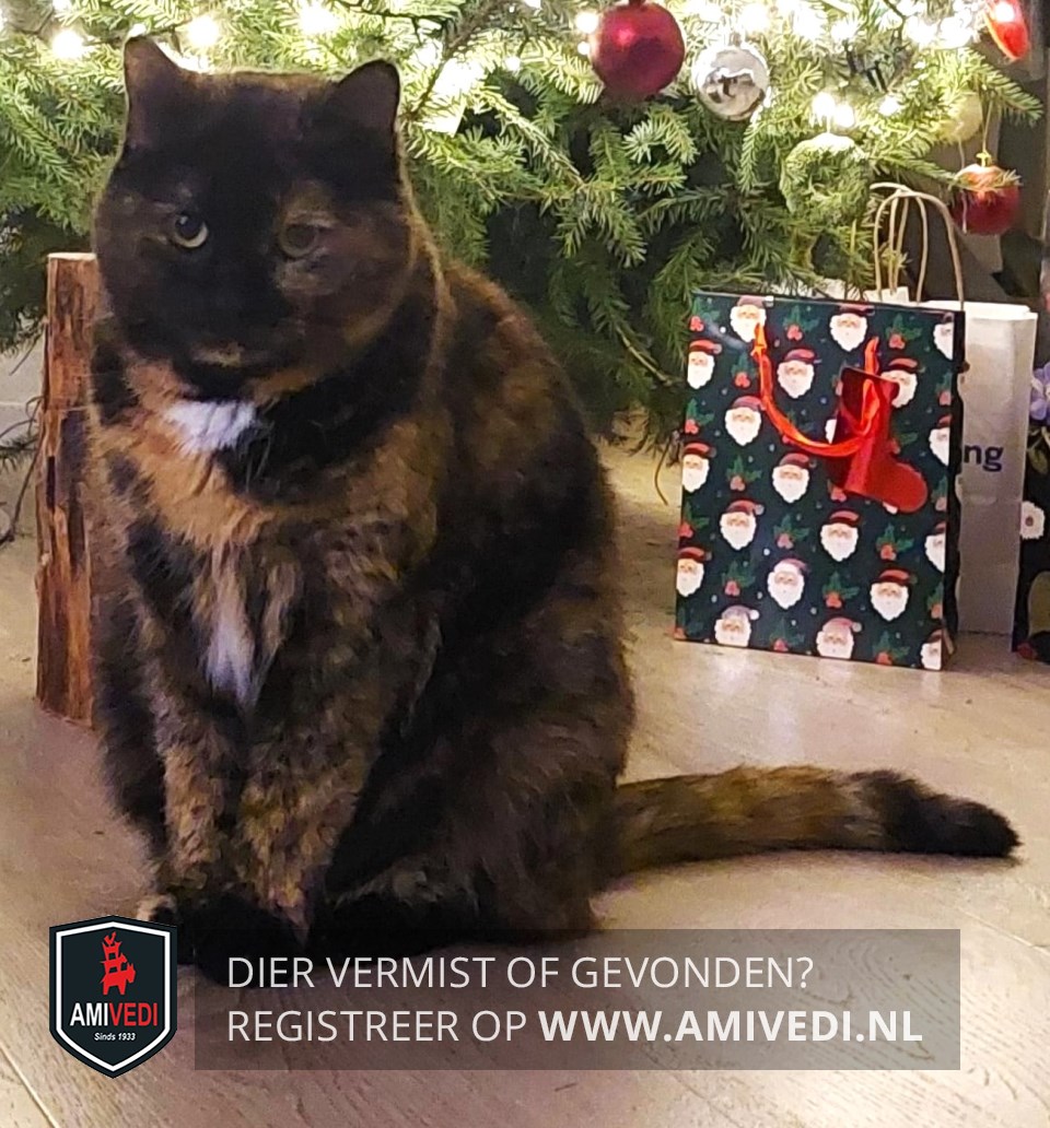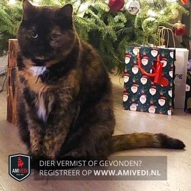 | Signalement | Schildpad met wit. Voornamelijk zwart met rood gemêleerd, voorhoofd voor de oren, neusbrug, neus, neusje en rechterkant snoet zwart, net onder de hals een witte vlek, op de borst rode vlek, onder de borst tussen de voorpoten een witte vlek, poten zwarte voetjes, aan het rechter voorpoot een rode teen, aan het einden van de staart cypers rood geringd en een zwarte staartpunt. |