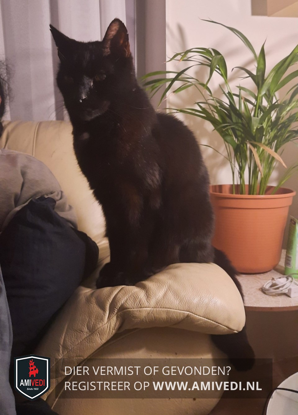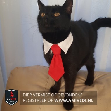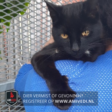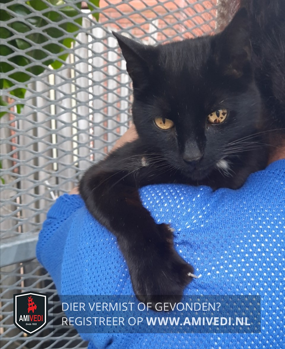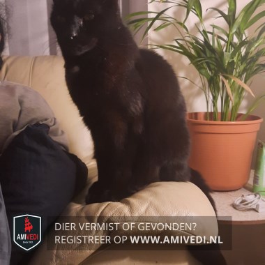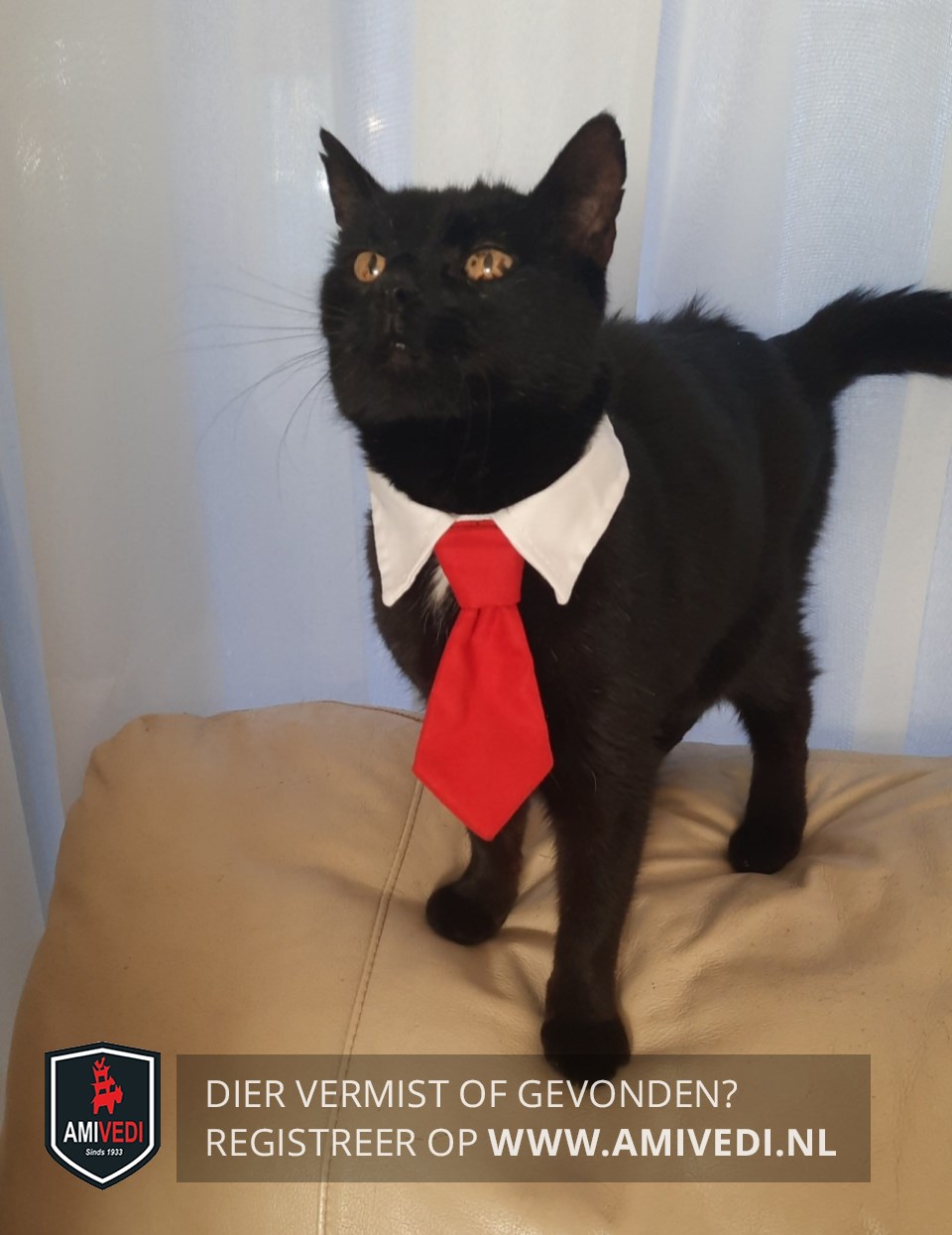 | Signalement | Egaal zwarte kater met wat wit rondom de bef. In zijn rechteroog zijn zwarte pigmentvlekken zichtbaar. Momenteel niest hij veel en mogelijk zit er wat snot in zijn linker neusgat. |