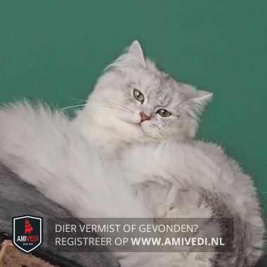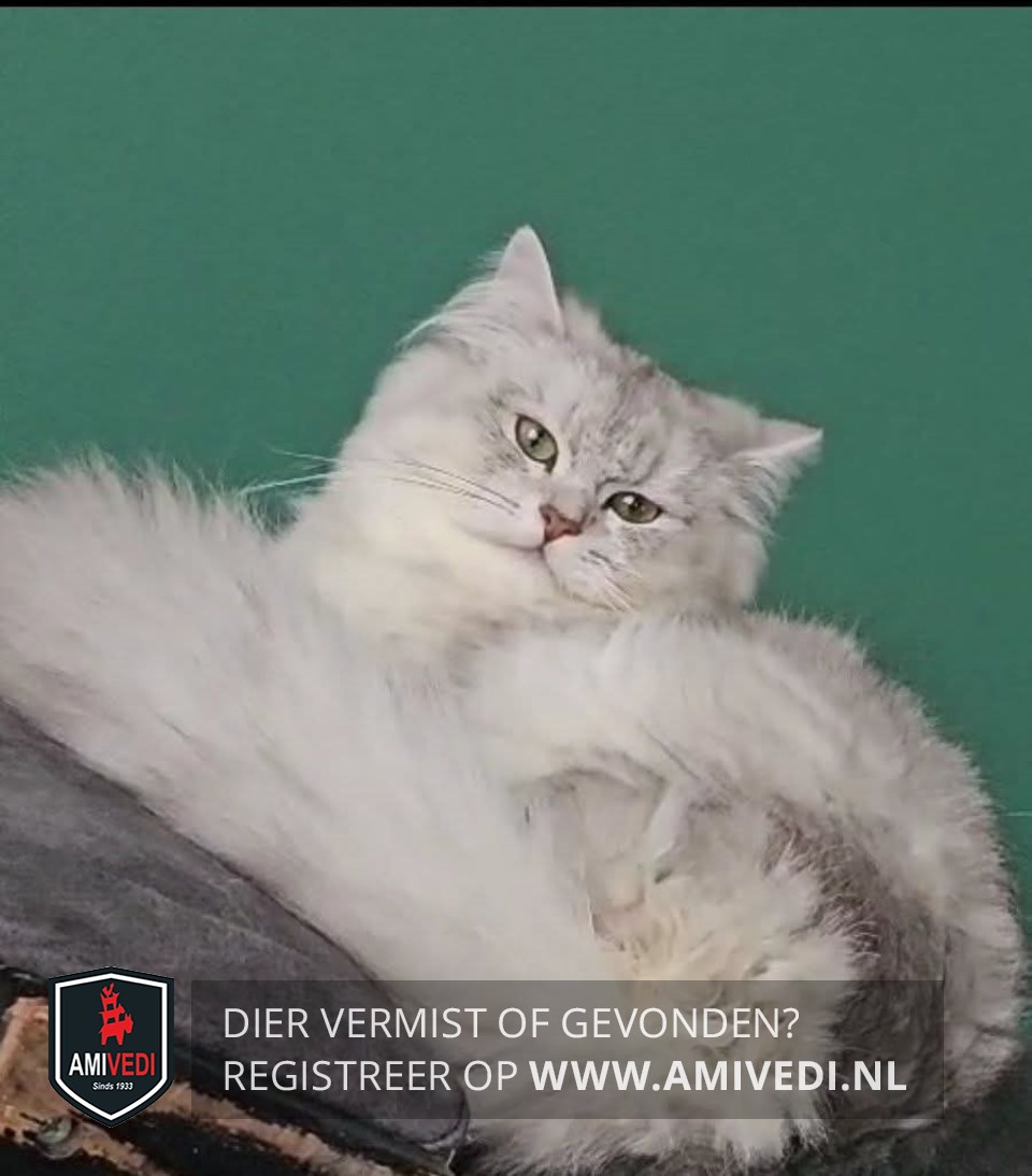 | Signalement | Perzische kat, meest wit en lichtgrijs met wat cyperse tekening op de kop en de staart; grijzig vlak achterop de rug |