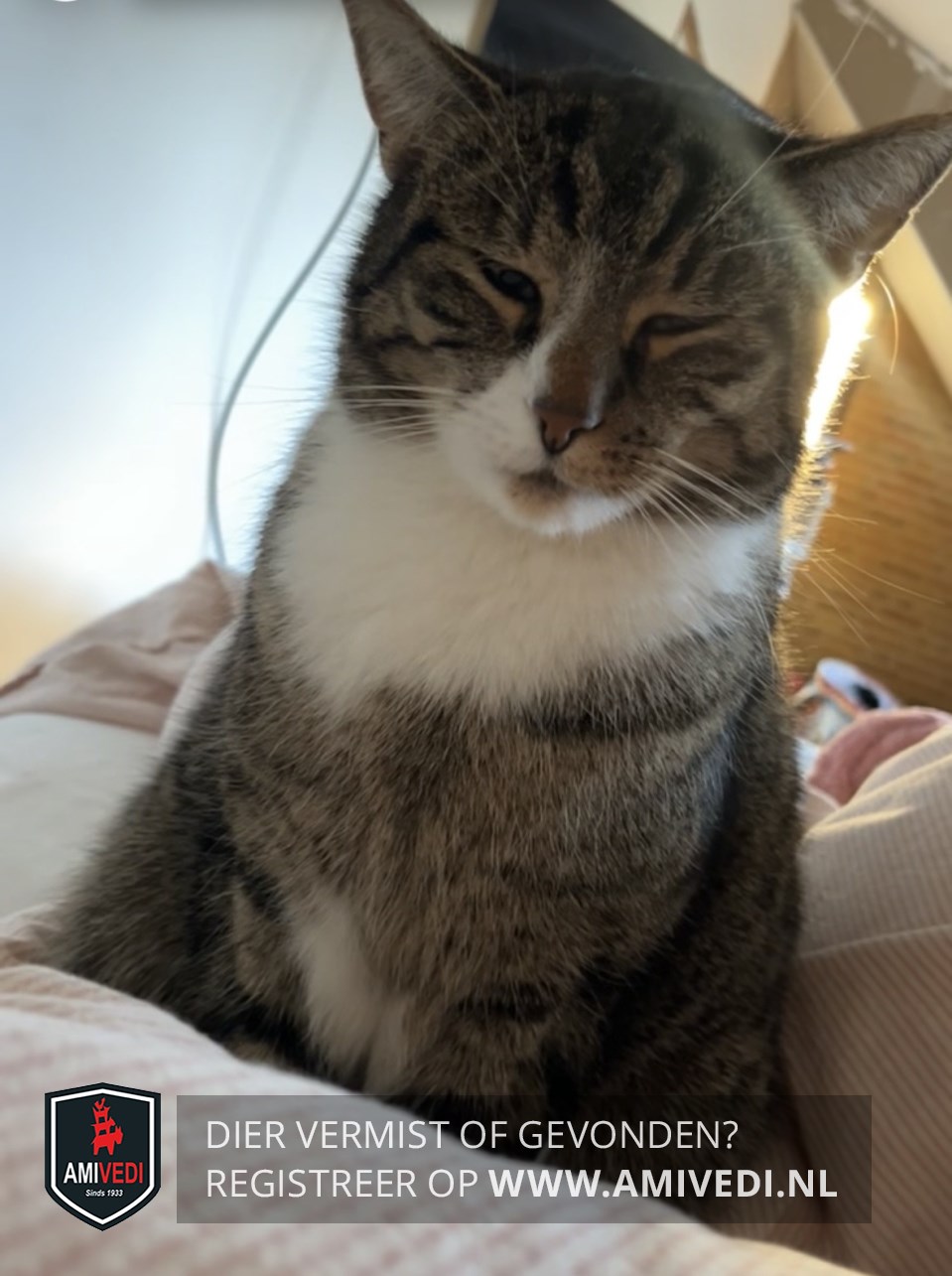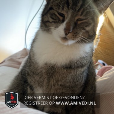 | Signalement | Cypers bruine kop, wit naast de neus rechts, kijkt een beetje scheel, witte kin, grote witte bef, cypers bruin lijf, voorpoten hebben bovenin een witte vlek en witte sokjes, achter poten witte sokjes. |