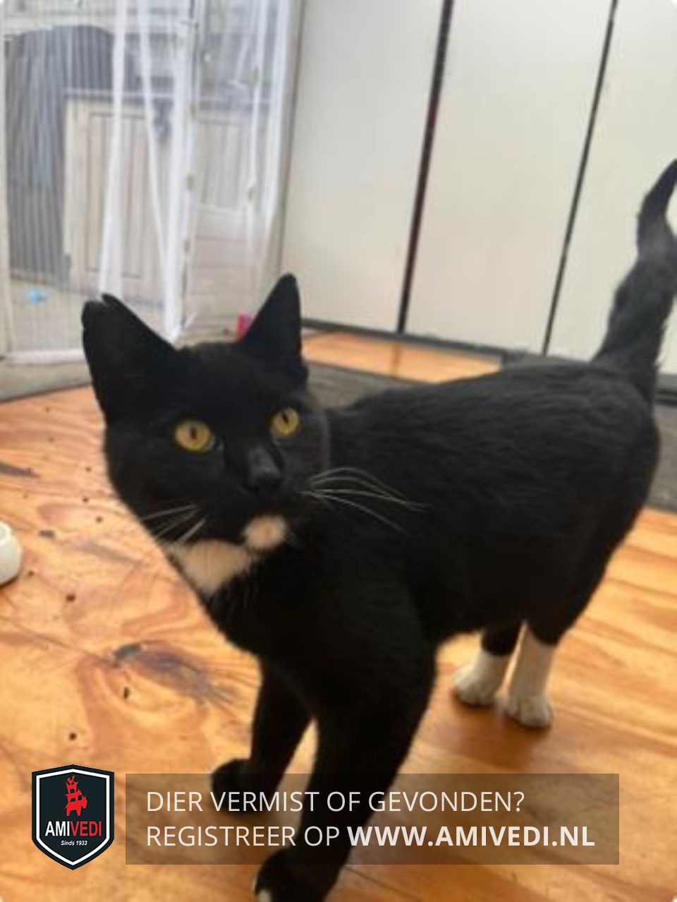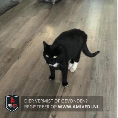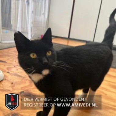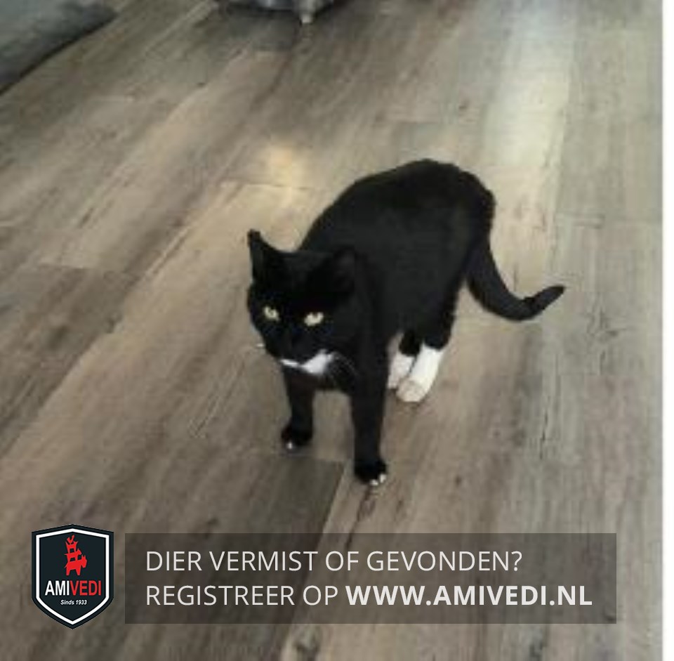 | Signalement | Witte bef, witte voortenen, achter witte sokken. Witte vlek op kin. Verder zwart. |