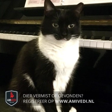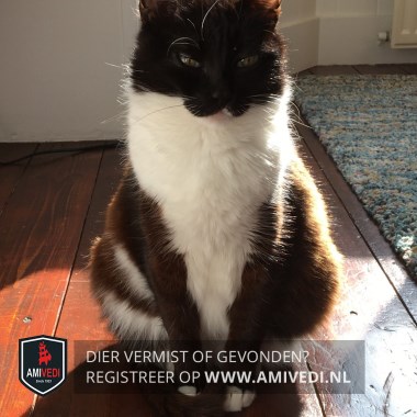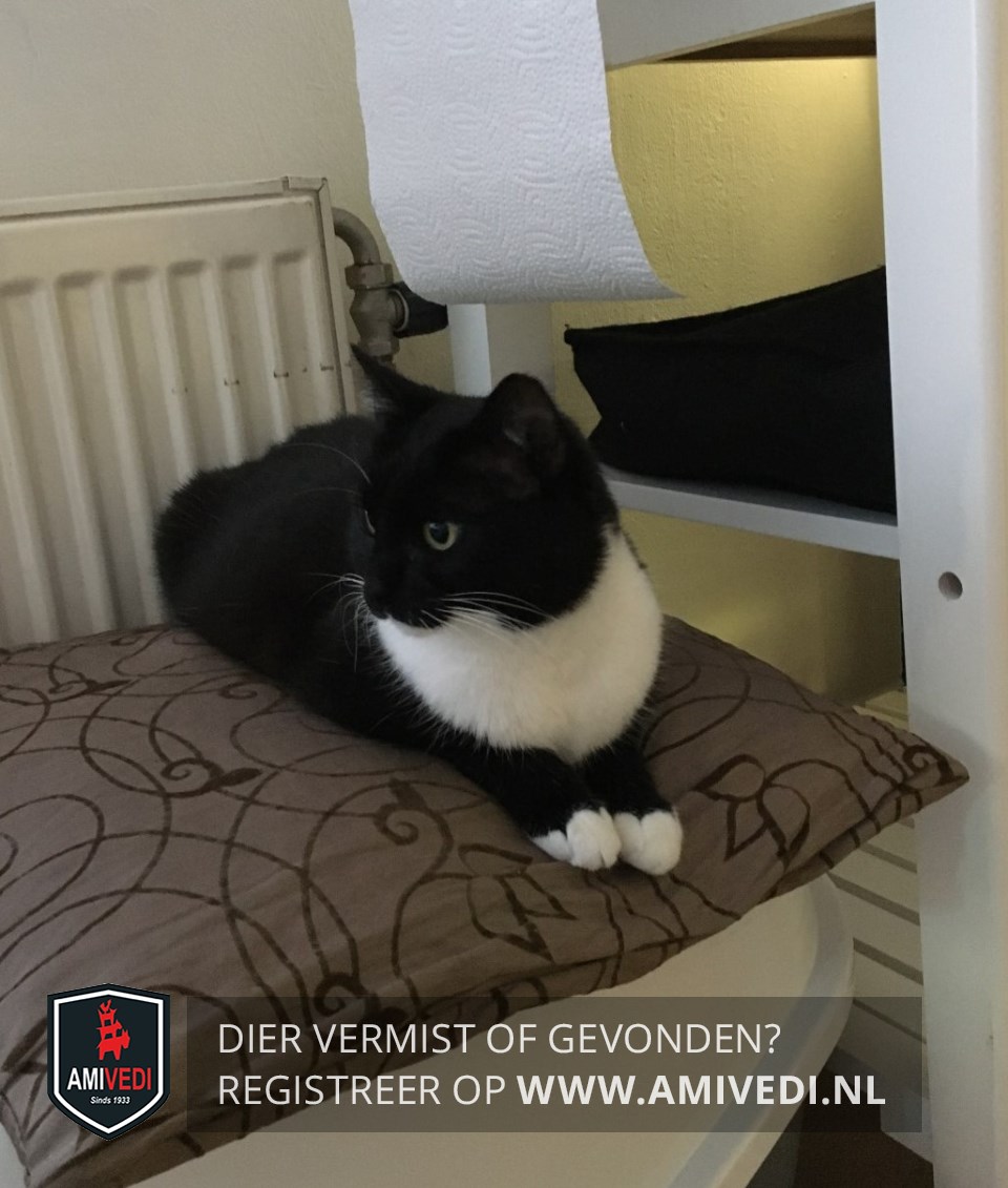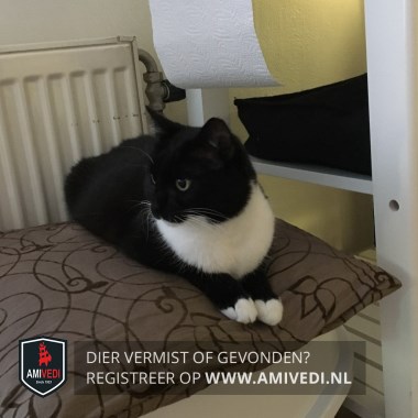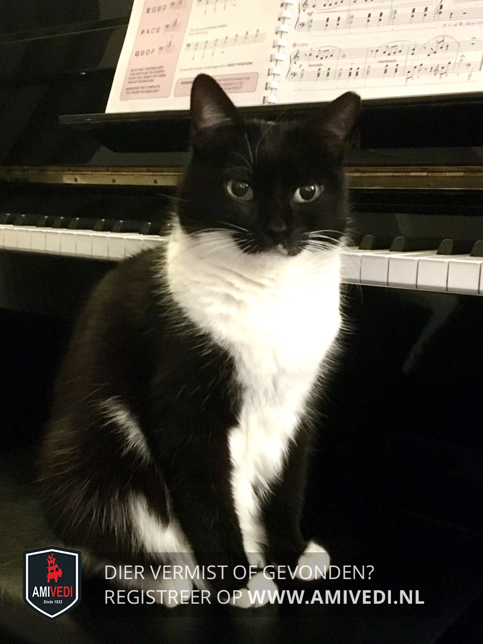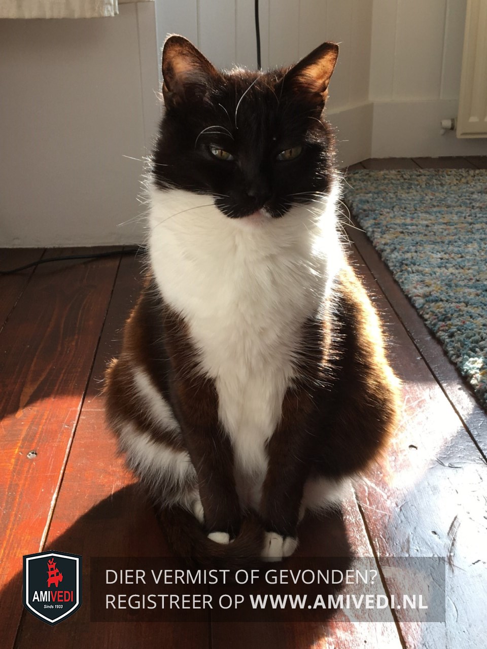 | Signalement | Onderste rand van linker bovenlip is wit, de kop incl kin is wit doorlopend naar de volledige borst en buik, witte teentjes voor en witte sokjes? achter (tuxedo kat), kan niet miauwen, angstig en kent de omgeving niet |