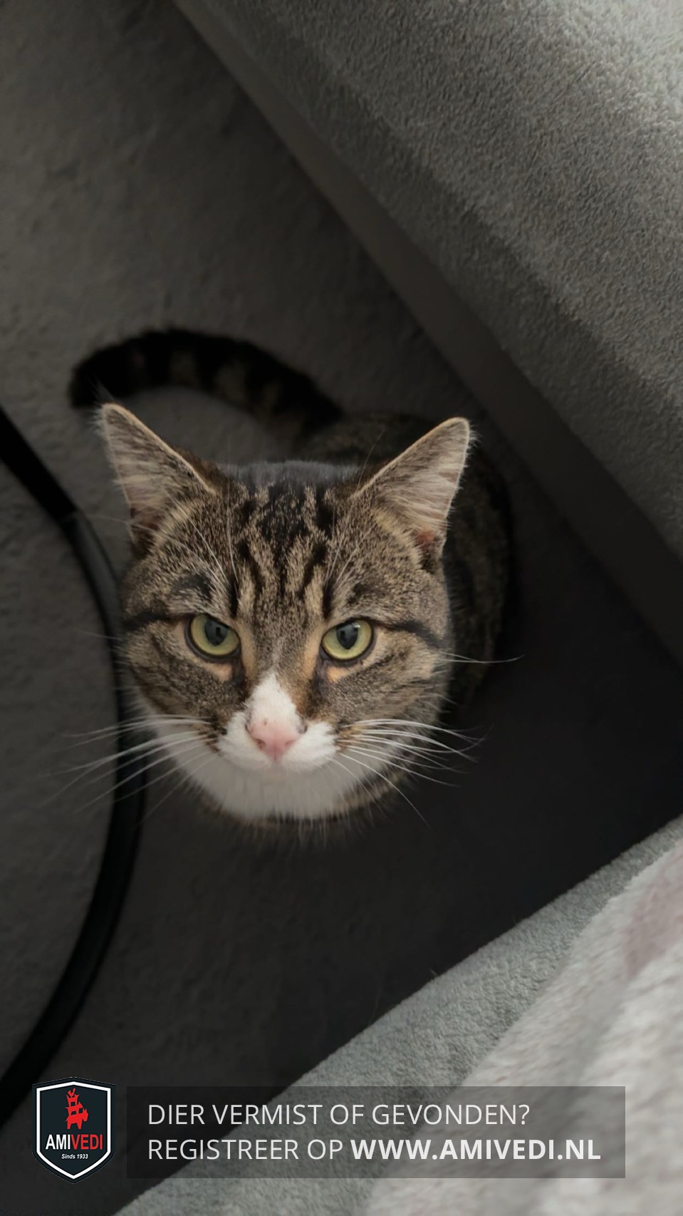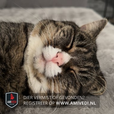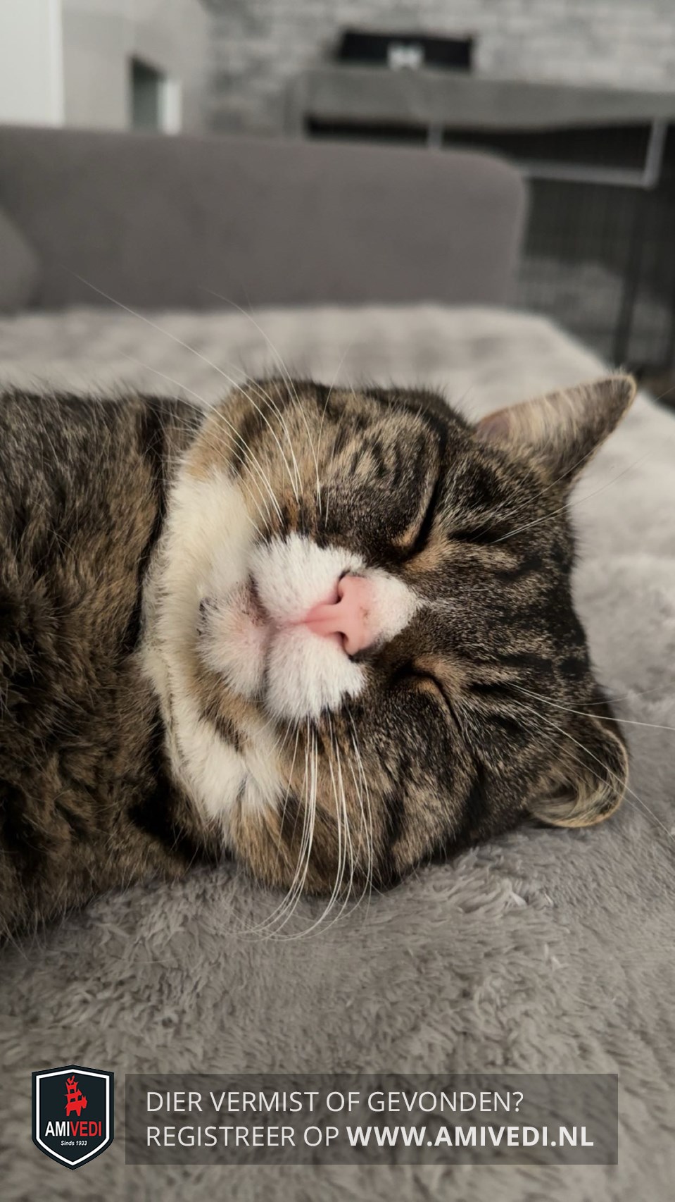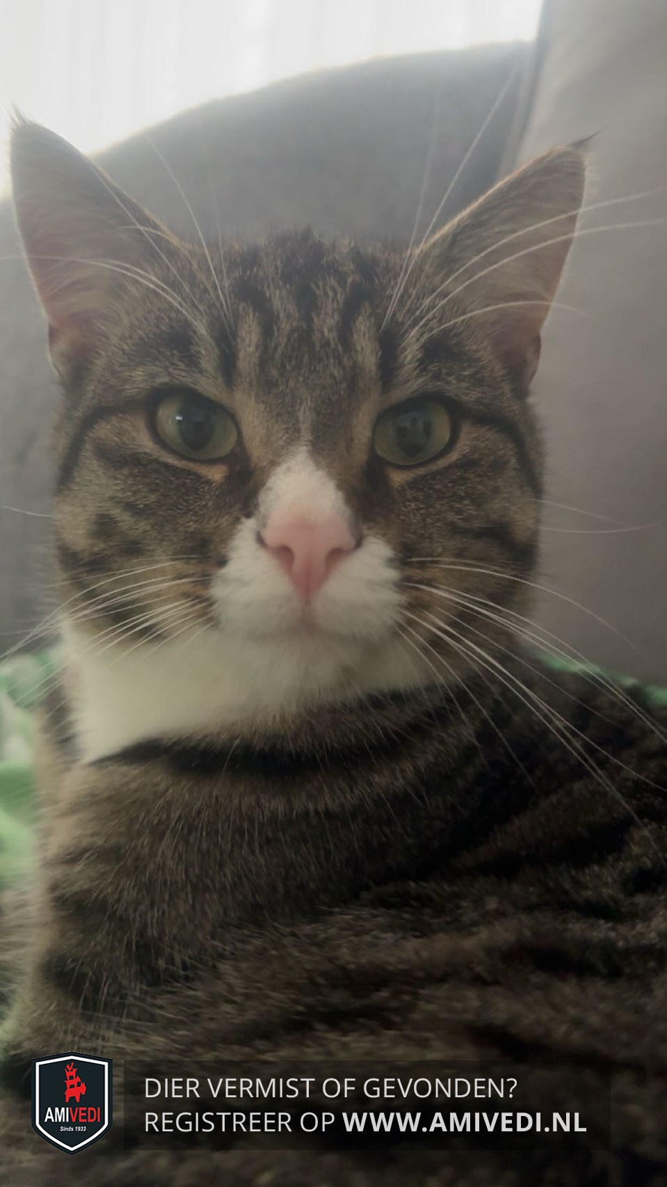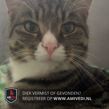 | Signalement | Macho is een kruising, gestreepte vacht bruin zwart wit. Groene ogen, hij heeft een bruin zwart vlekje onder zijn kin, Witte kin, bef. |