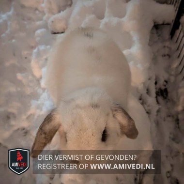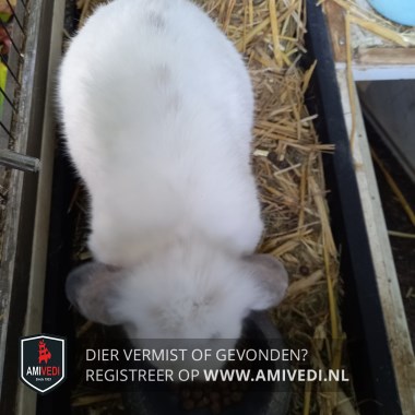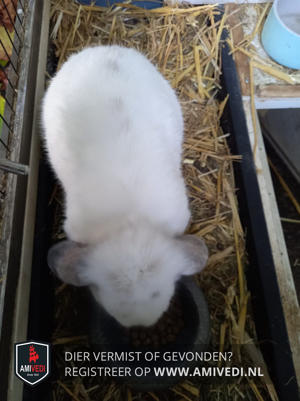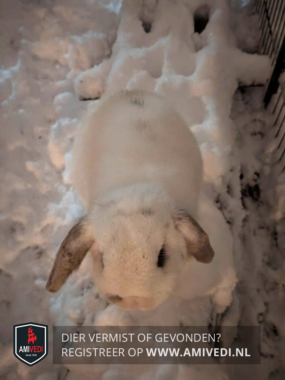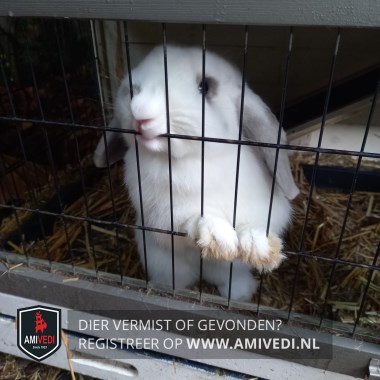 | Signalement | Wit hangoor Hollander konijn. Bovenop koppie kleine lichtgrijze vlek. Oren aan de uiteinden grijzig. Op de ruggengraat paar vage grijze vlekjes. |
