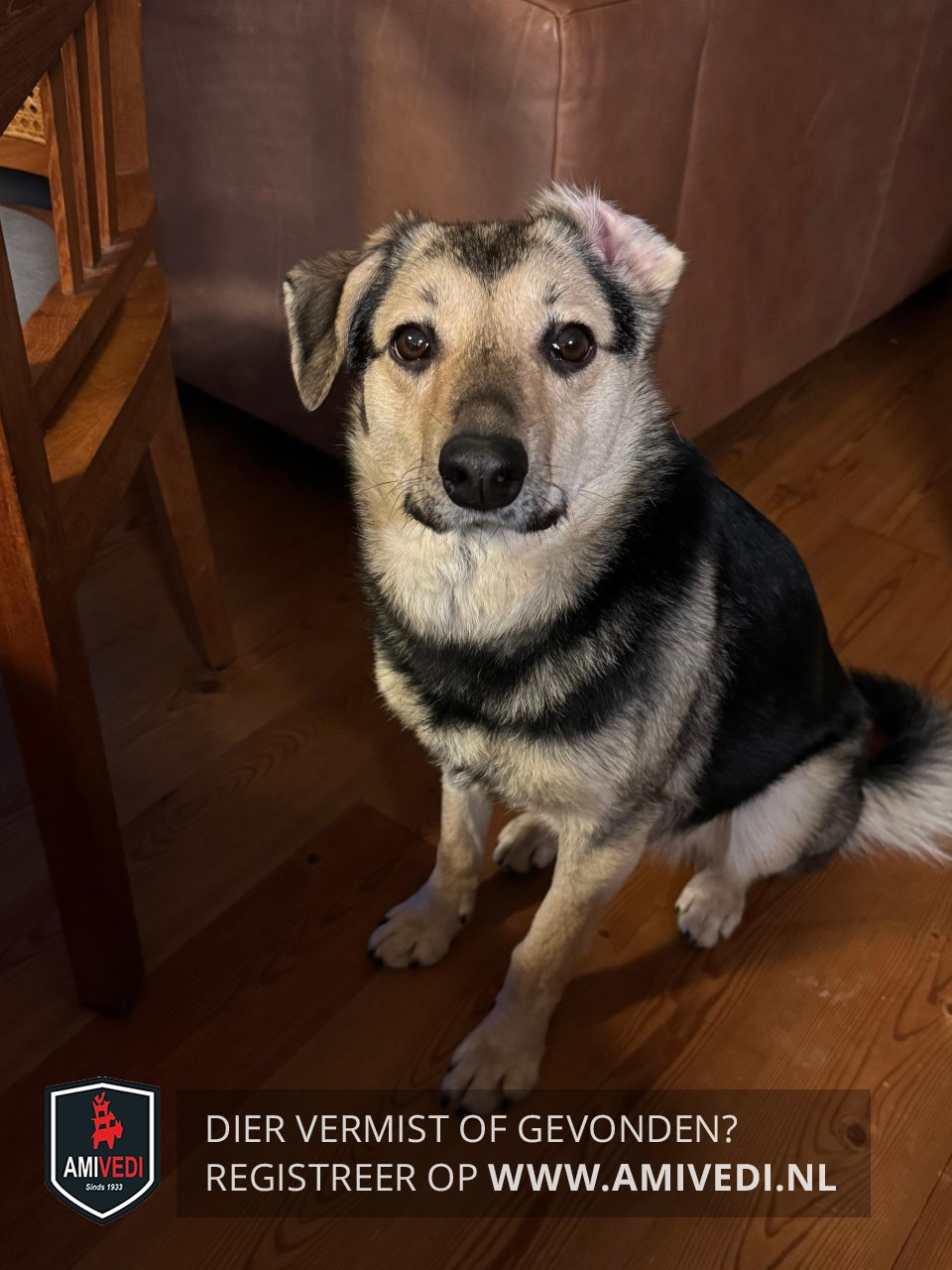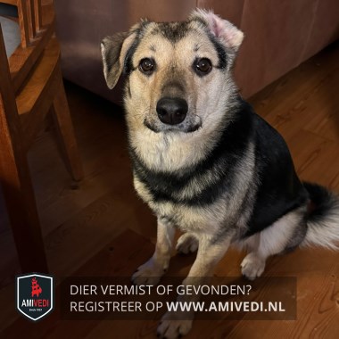 | Signalement | Kruising, teef. Bruine kop, bij de bek en op de kop iets zwart. Zwart met bruin gemêleerde hangende oren. Poten bruin en haren onder de staart. Op de rug voornamelijk zwart en haren op de staart. NIET NAJAGEN, ERG SCHUW. |