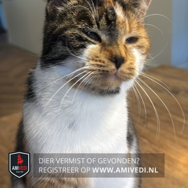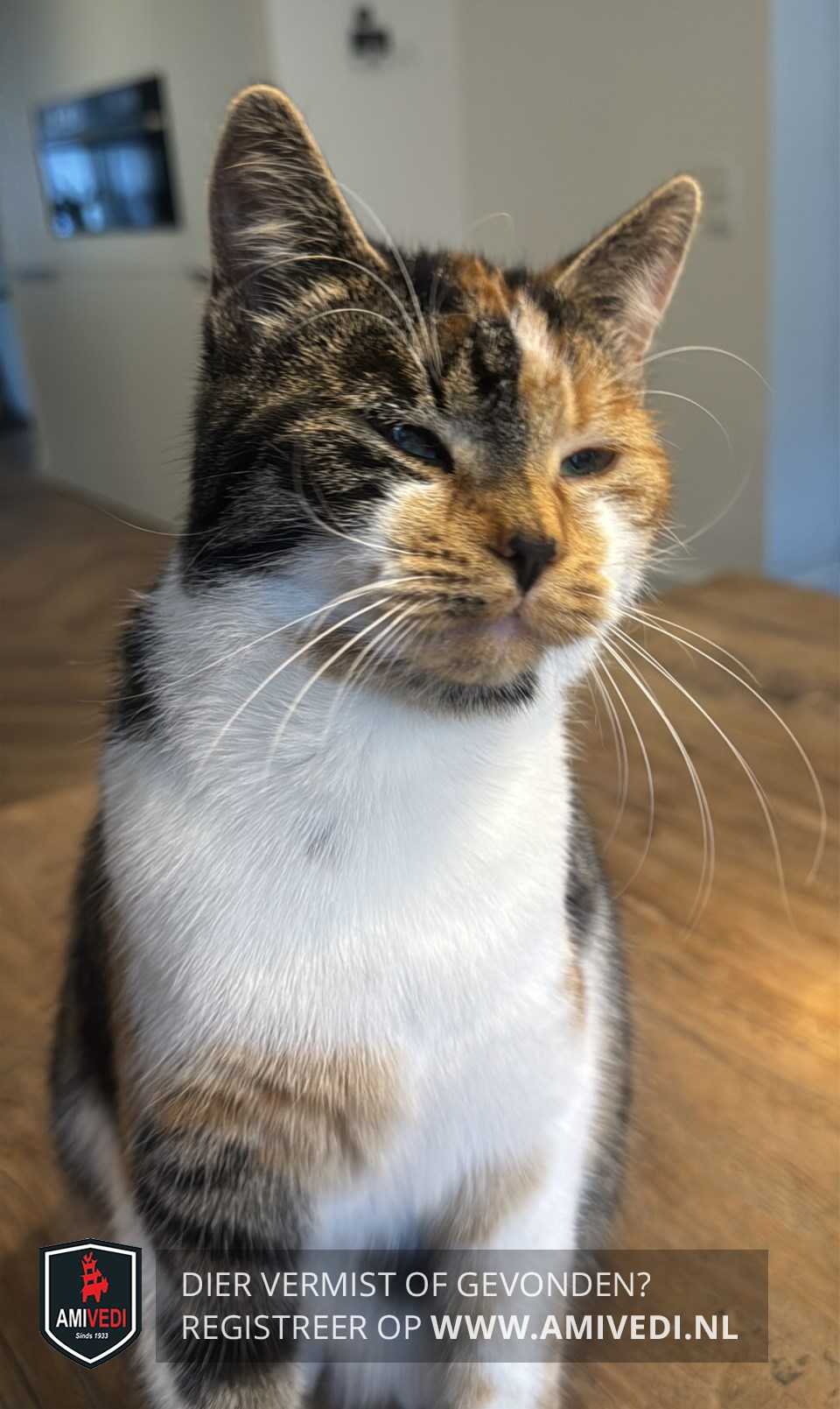 | Signalement | Schildpadpoesje. Op het kopje cypers grijs/zwart/rood gemêleerd. Rechterkant van het gezichtje is cypers grijs/rood gemêleerd, linkerkant cypers rood dat doorloopt over en langs het oogje. Zwarte neuspunt. Rond het bekje veel rood met wat grijs/zwart. Witte borst en buik. Op de rug cypers grijs/rood gemêleerd dat doorloopt over de zijden. Rechter voorpootje bovenin rood/zwart/grijs met een wit kniekousje. Rechter voorpootje wit met rood. |