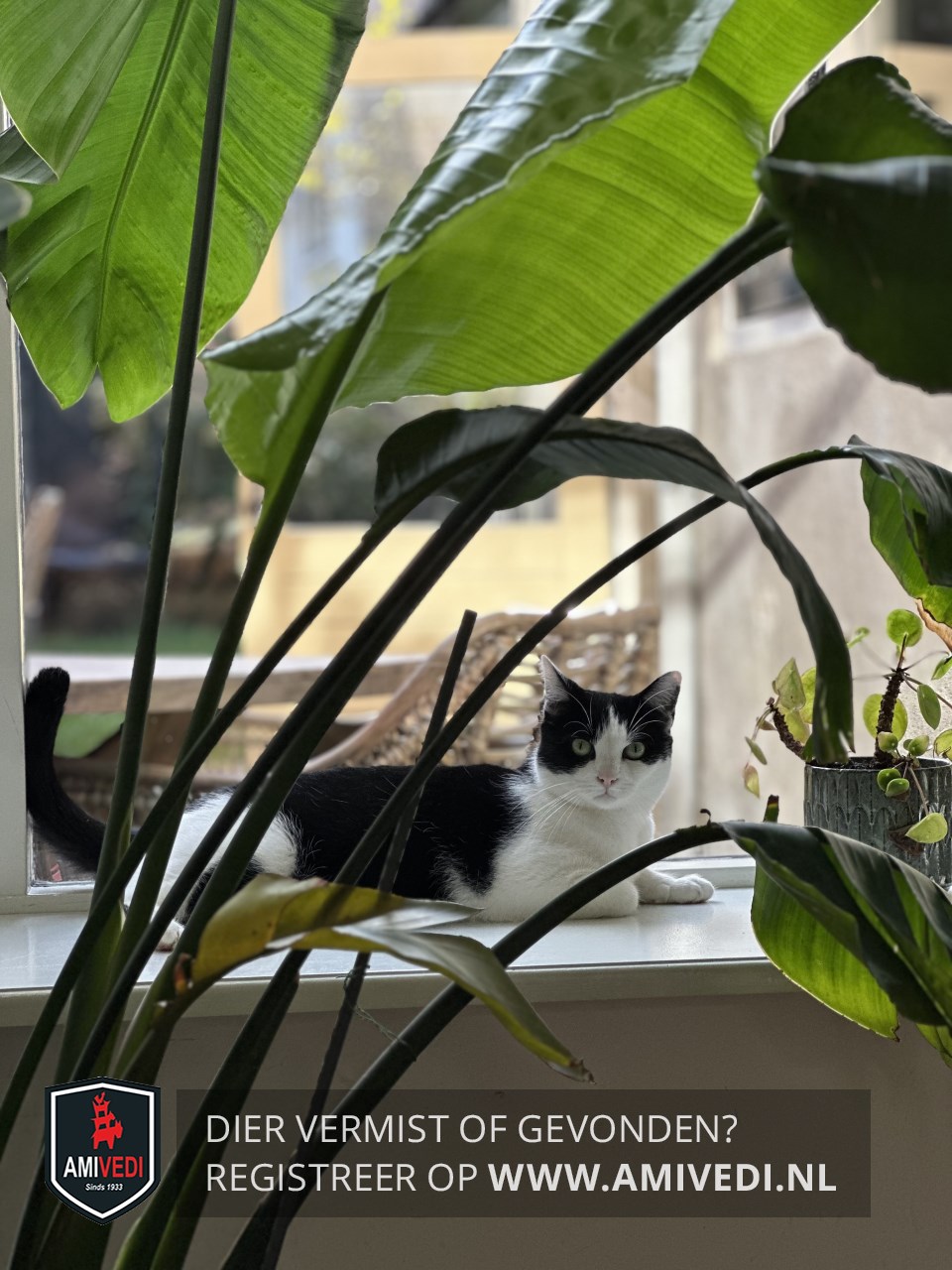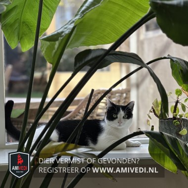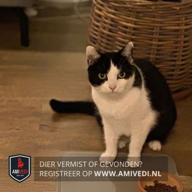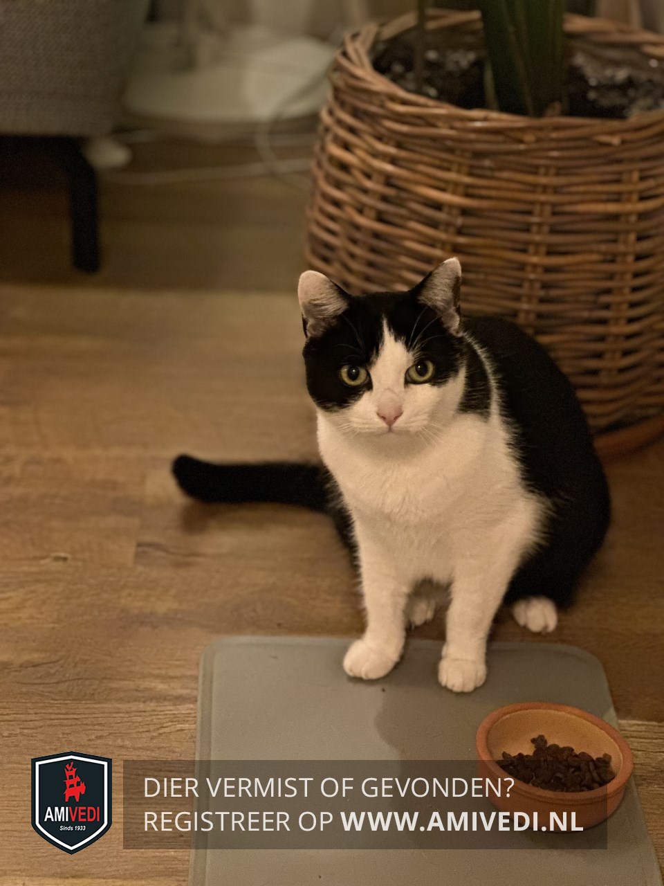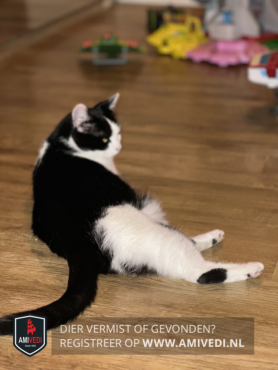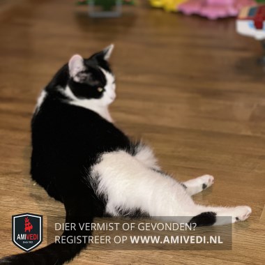 | Signalement | Wit tussen de ogen, rondom neus, mond, kin, bef en buik Beide voorpoten wit. Rechter achterpoot is wit met een zwarte vlek op de hak en zwart vlekje bij de kussentjes. Linker achterpoot wit met zwarte vlek en een zwart vlekje bij de kussentjes. Ze kan wat bang zijn. |