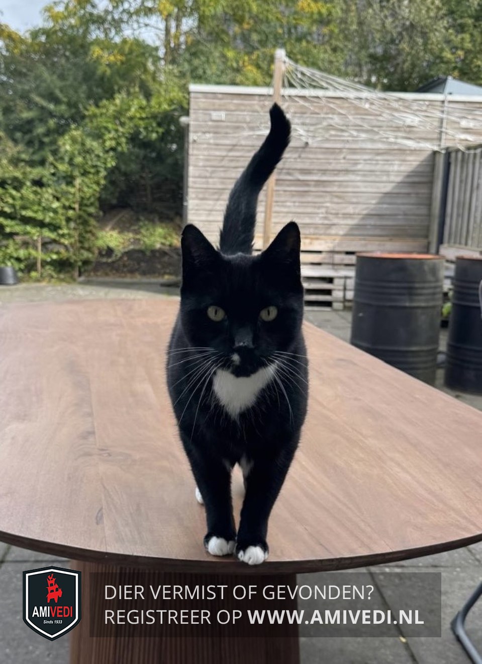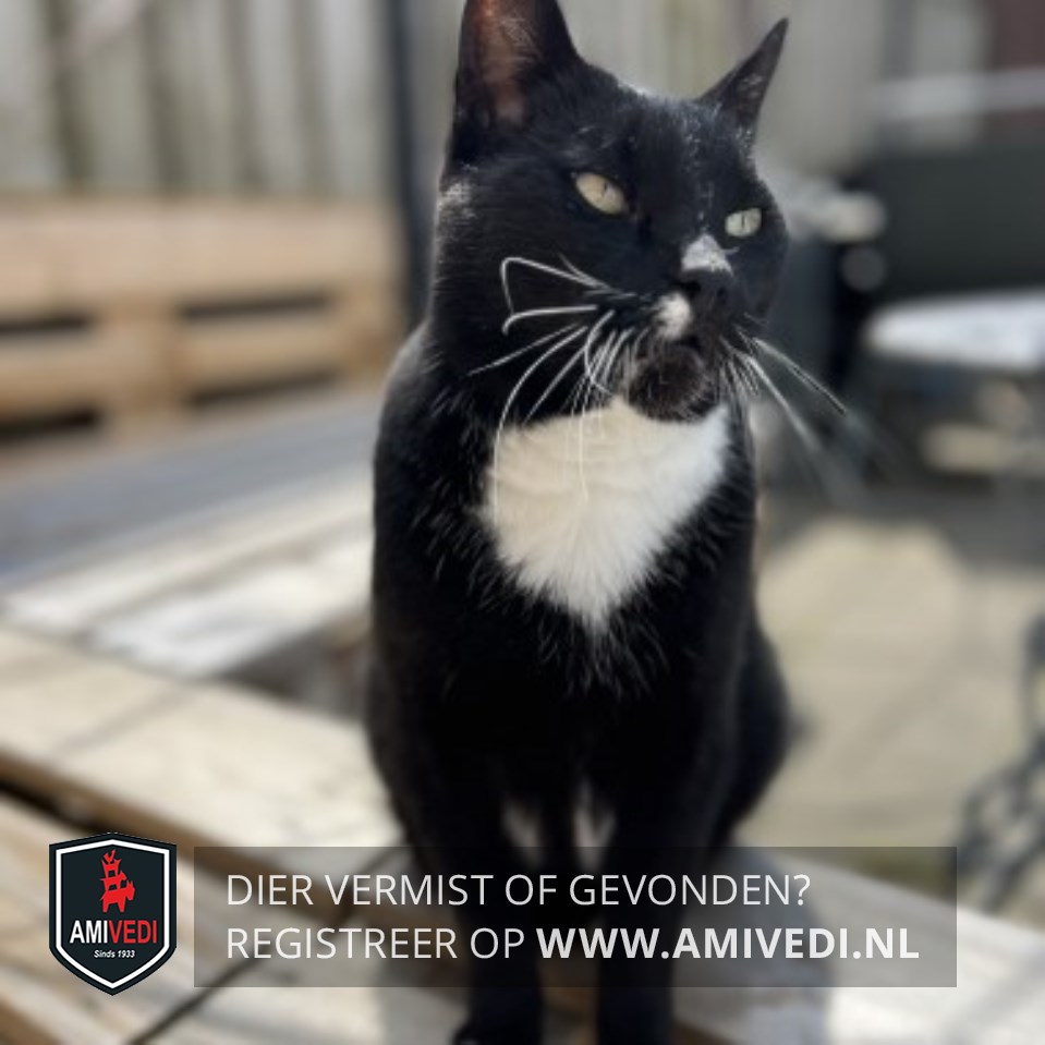 | Signalement | Zwarte kater met op de bovenlip aan de rechterzijde van de neus een wit vlekje. Gele ogen, zwart neusje en witte snorharen. Wit in de hals en op de borst en onder de beide oksels een witte vlek. Ook een witte vlek op de onderbuik. De voorpoten hebben witte teentjes, achterpoten hebben een wit voetje. |