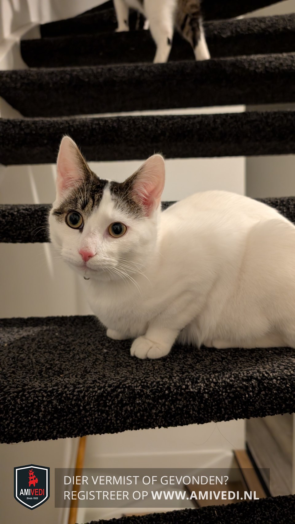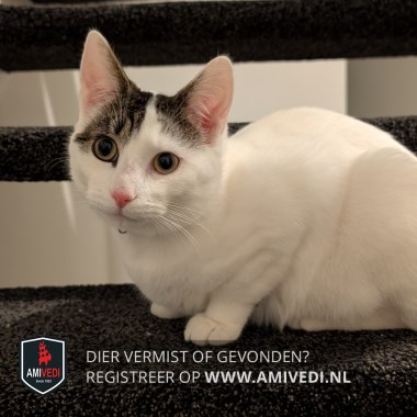 | Signalement | Witte kat/kitten, met grijze staart, een enkel grijs voetje en grijs op z'n kop. Is extreem lief en zachtaardig. |