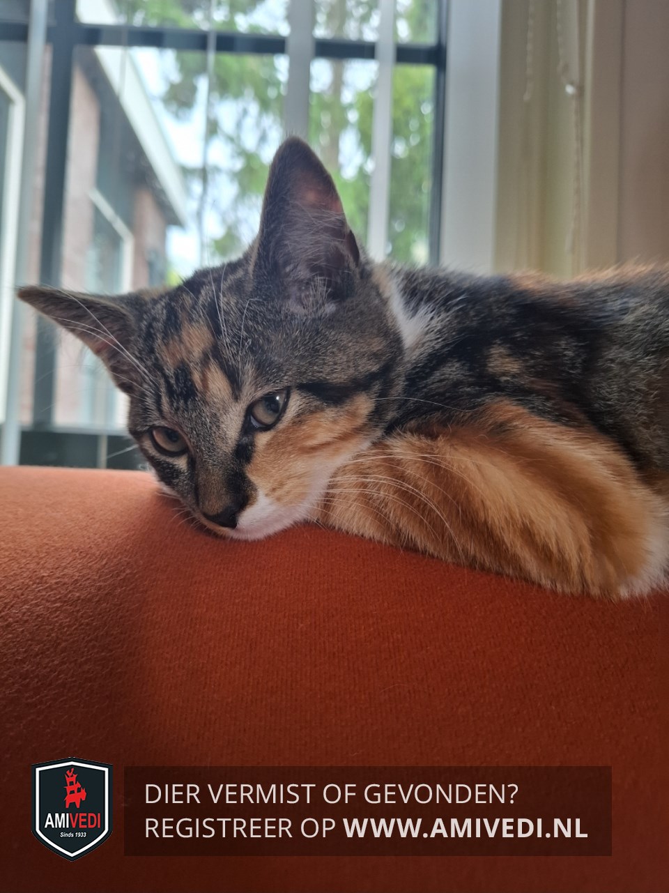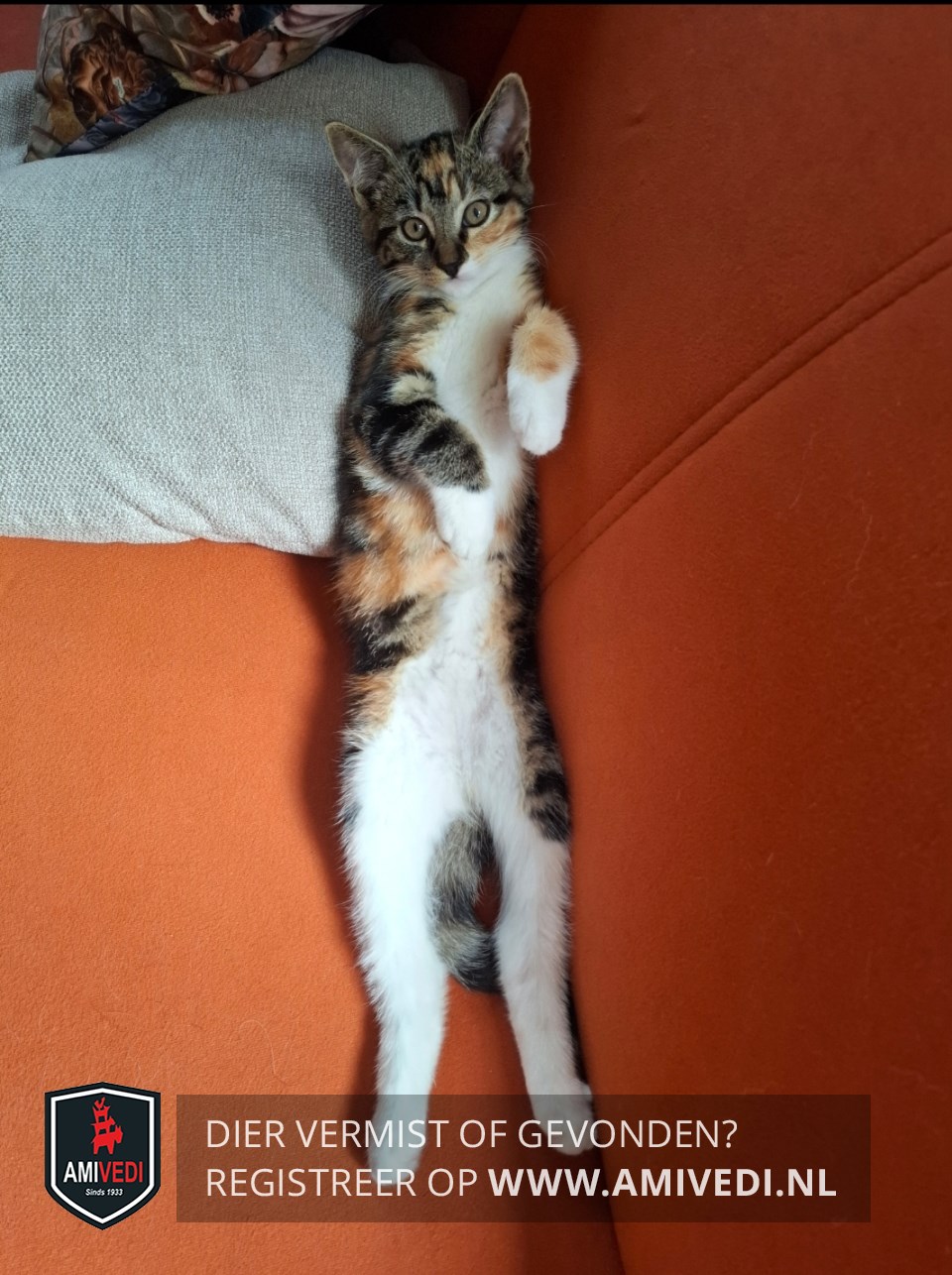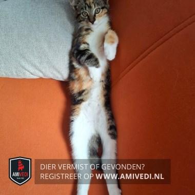 | Signalement | Cyperse schildpad-wit poes. Cypers grijs kopje met wat rood op de bles en een rode wang links. Witte kin, keel, borst en buik. Rood gestreept voorpootje links; rechts grijs gestreept, beiden met witte voetjes. Haar achterpootjes zijn wit met een klein rood vlekje rechts. De rug en flanken zijn cypers rood, zwart en wit. Op haar voorhoofd staat de kenmerkende M die cyperse katten hebben. |
