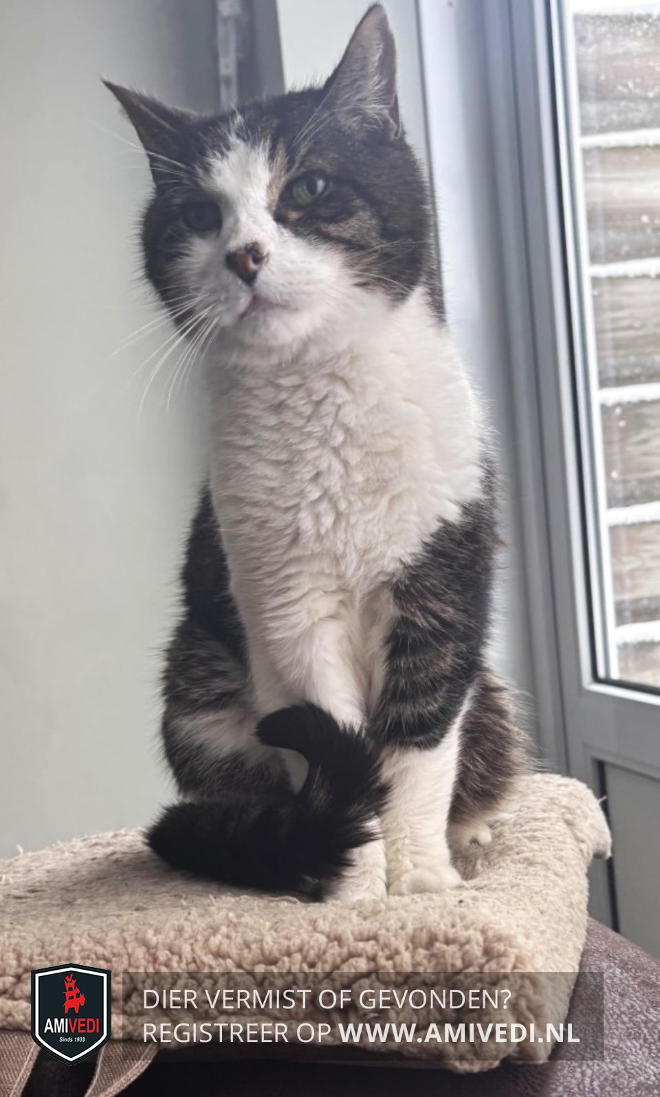 | Signalement | Cypers bruinzwart gestreept met wit. Voornamelijk cypers bruin, op het voorhoofd breed wit met bovenaan een dun wit puntje, neusbrug en neus wit, witte snoet, roze neusje met kleine zwarte vlekjes, onder het neusje, kin, borst wit doorlopend naar de nek en onderkant, rechter voorpoot wit, linker voorpoot vanaf de schouder naar de voorkant tot halverwege cypers bruin, de rest van poot wit, onderlijf en buik wit, wit aan de achterpoten, staart cypers geringd met een zwarte staartpunt. |
