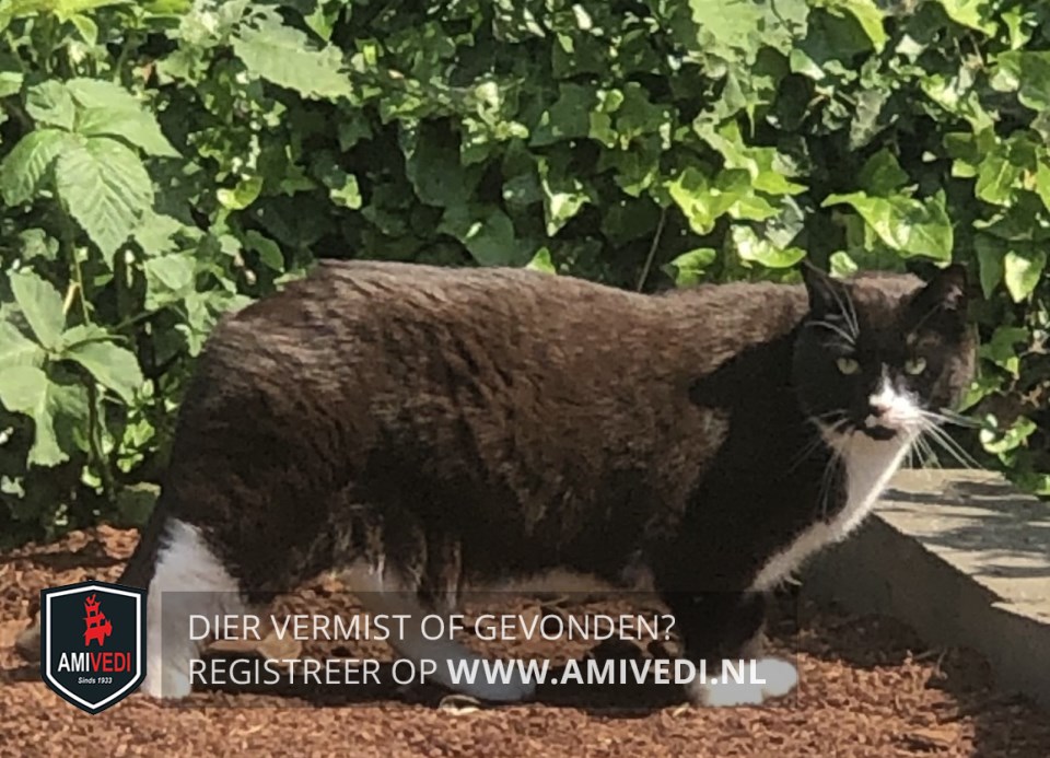 | Signalement | Zwart met witte accenten. Zwart petje en masker t/m de wangen. Witte snorharen, witte smalle streep op de neusbrug uitlopend naar een witte vlek linkerzijde neus. Neusje rechts zwart, links roze. Zwarte kin, witte bef, borst en buik. Voorpootjes witte voetjes, achterpootjes wit vanaf de kniekousjes. Zwarte staart. |