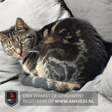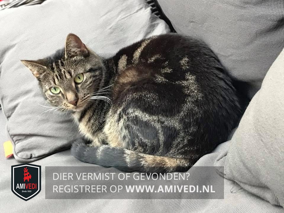 | Signalement | Bruin met zwart cypers gemarmerd/gestreept. Licht rond het bekje. Witte snorharen. Punt neusbrug licht van kleur. Groene ogen. Borst lichtbruin. Donkere streep over ruggengraat. Lijf is gemarmerd. Staart lichtbuin met brede zwarte ringen. Ze heeft medicatie nodig voor haar schildklier. Ze is erg mauwerig van zichzelf. |