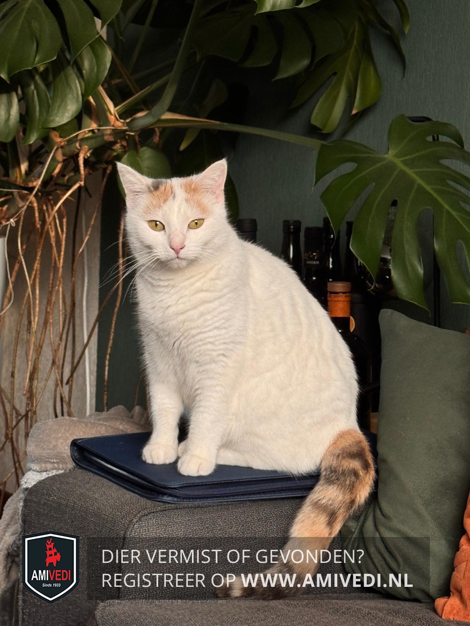 | Signalement | Poes. Wit met wit en zwart. Zwart en wit op het petje. Staart rood met zwarte accenten. |