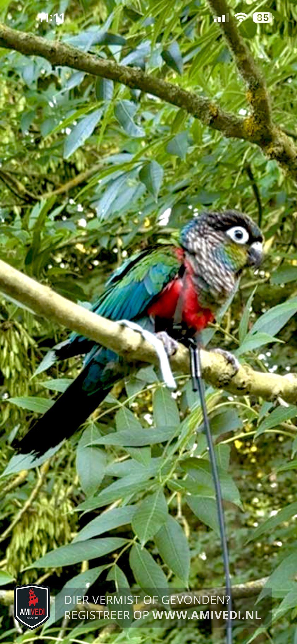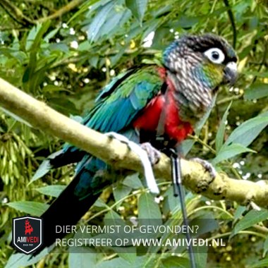 | Signalement | Pyrrhura Perlata, grijze kop, blauw/groene vleugels, rode buik. |