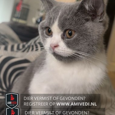 | Signalement | Kitten, poes. Grijs met op de neusbrug wit. Naast de snuit wit, onder de bek grijs. Witte borst. |