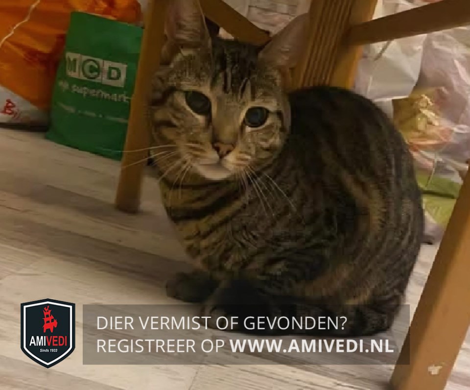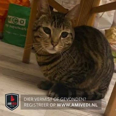 | Signalement | Cypers bruin zwart gestreepte kat/poes met wat wit rondom de bek. Lichte randjes om de oogjes en een geringde staart. |