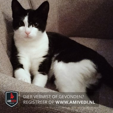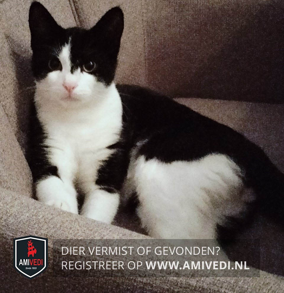| Signalement | Zwart-witte kater. Witte snuit waarvan de bles rechts boven het oog zit. Witte borst, buik en poten. Over kop, rug, flanken en staart zwart. |