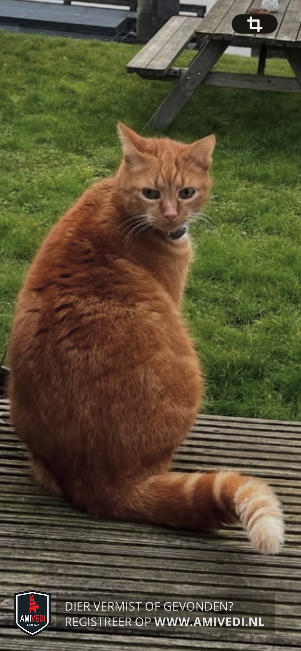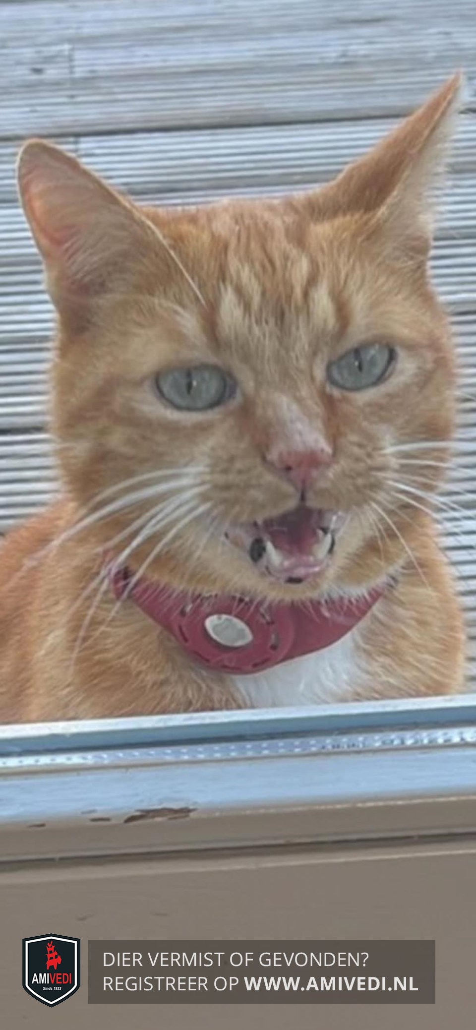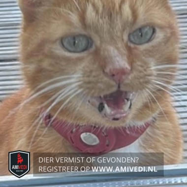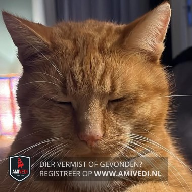 | Signalement | Cypers rood/oranje met wit. Heeft zwarte plekken in zijn mond (moedervlekken). Witte bef/borst. Laatste 7 centimeter van zijn staart is zijn haar iets minder omdat daar een wond heeft gezeten. Is boos op zijn staart, kan hier naar grommen. Luistert goed naar zijn naam. |