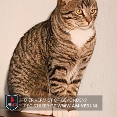 | Signalement | Cypers bruin-zwart gestreept met wit. Witte kin, bef en wat wit tussen de pootjes. Voor witte voetjes, achter witte kousen. Wit puntje aan staart |
