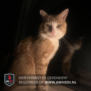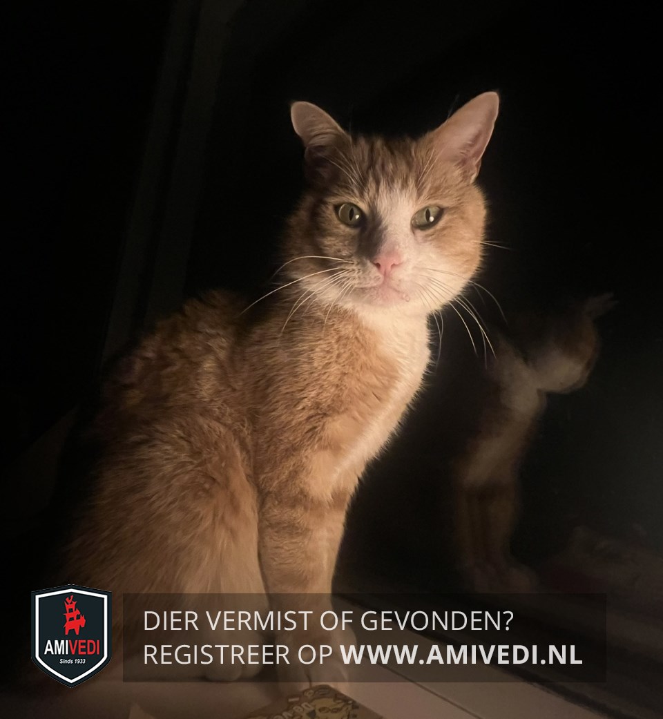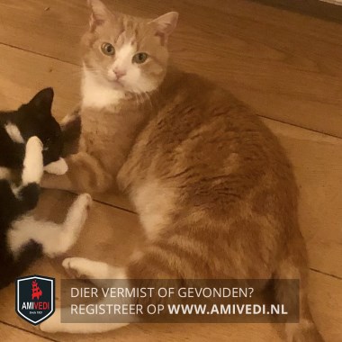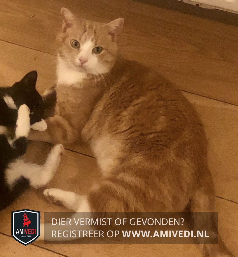 | Signalement | Grote rood-oranje-witte kater met cyperse tekening, groene ogen, witte borst, buik en snuit, witte laarsjes aan de achterpoten, witte sokjes aan de voorpoten, en een roze neus. |