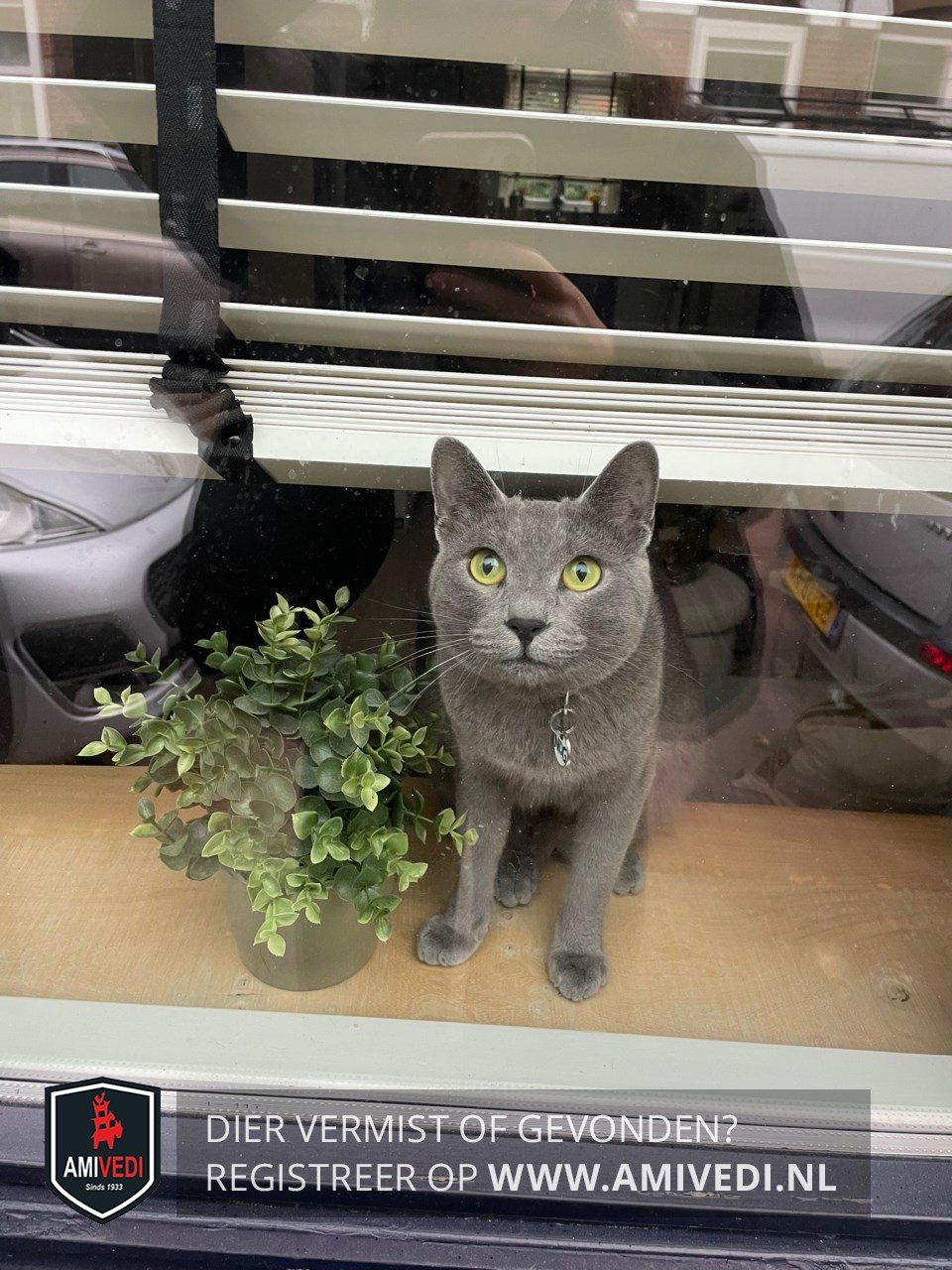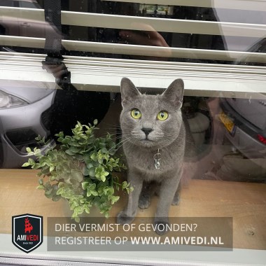 | Signalement | Grijze kortharige vacht, groen/gelige ogen. |