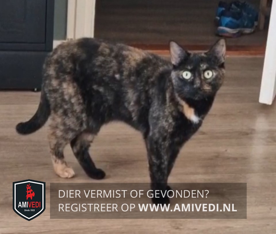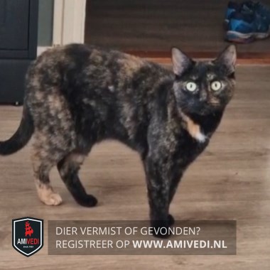 | Signalement | Schildpadpoesje, zwart met rood/ oranje. Ze heeft een rood achterpootje. Klein wit vlekje borst. |