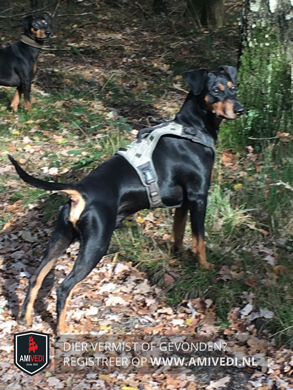 | Signalement | Duitse Pinscher 50 cm hoog 50 cm lang overwegend zwart met bruine accenten bij de kop, onderpoten en achterkant. Lange zwarte staart, zwarte flaporen. |