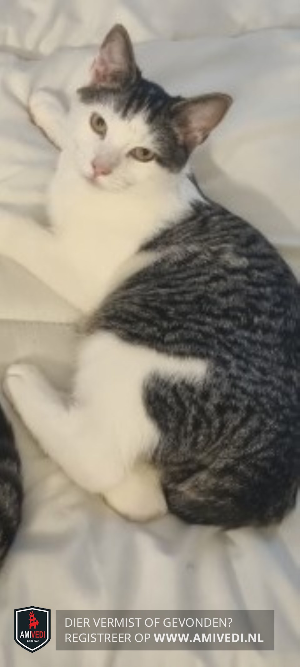 | Signalement | Slanke kat, redelijk schuw naar onbekende. Hij is over het algemeen wit met wat grijs/zwarte vlekken. |