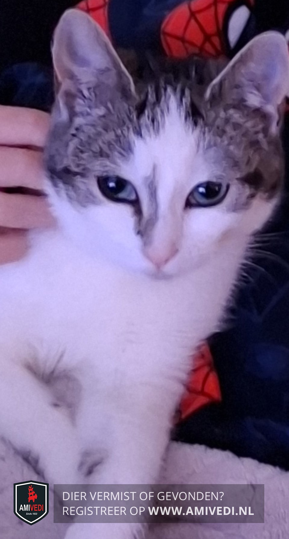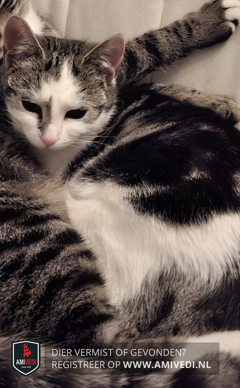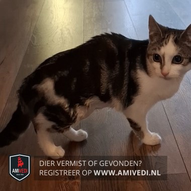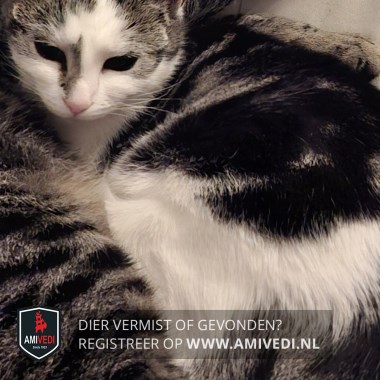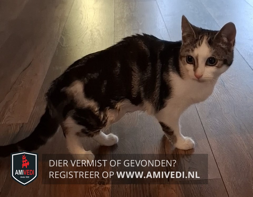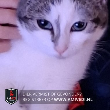 | Signalement | Cypers grijs/zwart gestreept met wit kitten. Blauwe ogen. Wit gezicht met opvallende grijze streep aan rechterkant neus. Witte borst. Veel wit aan haar pootjes. |