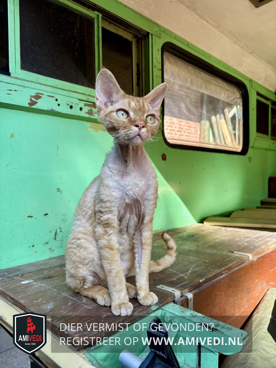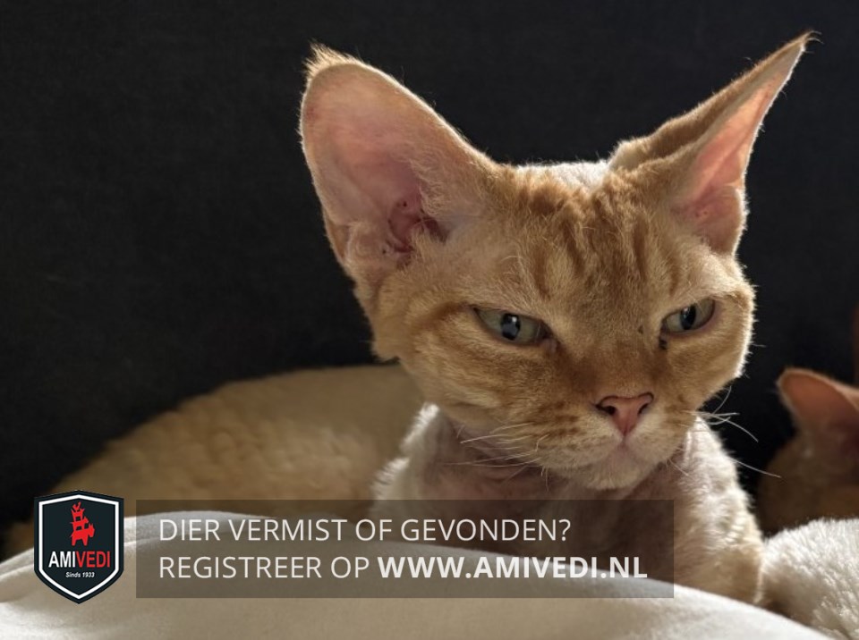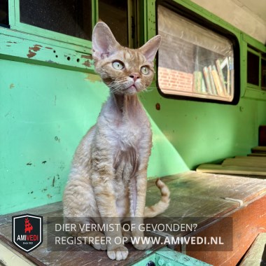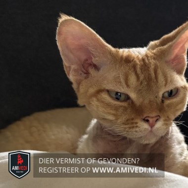| Signalement | Devon rex, kort gekrulde vacht, rood/oranje kopje, rood/oranje gestreepte pootjes en staart, met wit er doorheen. |