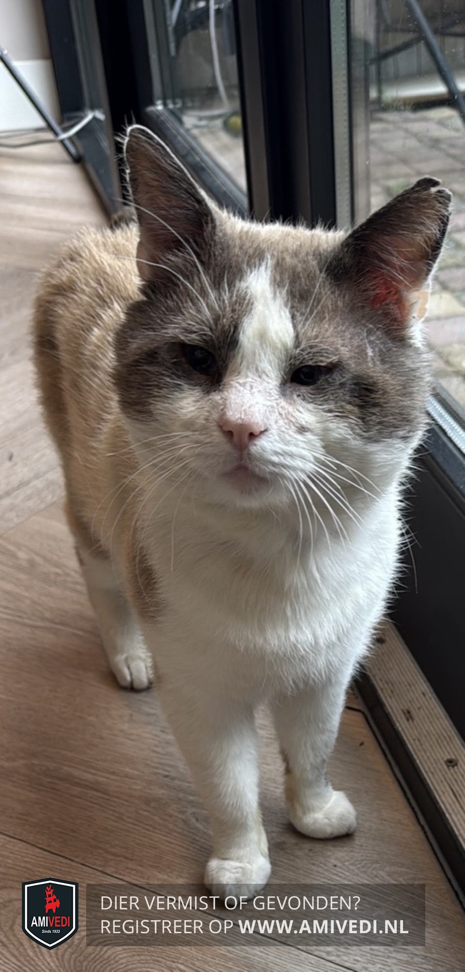 | Signalement | Grijs/bruin op de oren, rond de ogen, en een deel van de wangen. Wit op de bles, neusbrug, snoet, kin, kaaklijn, keel, hals, bef, borst, buik, en wit aan de poten. Beige op de rug en de flanken. Kan wat ontstoken ogen hebben. De punt van het linkeroor is beschadigd. |