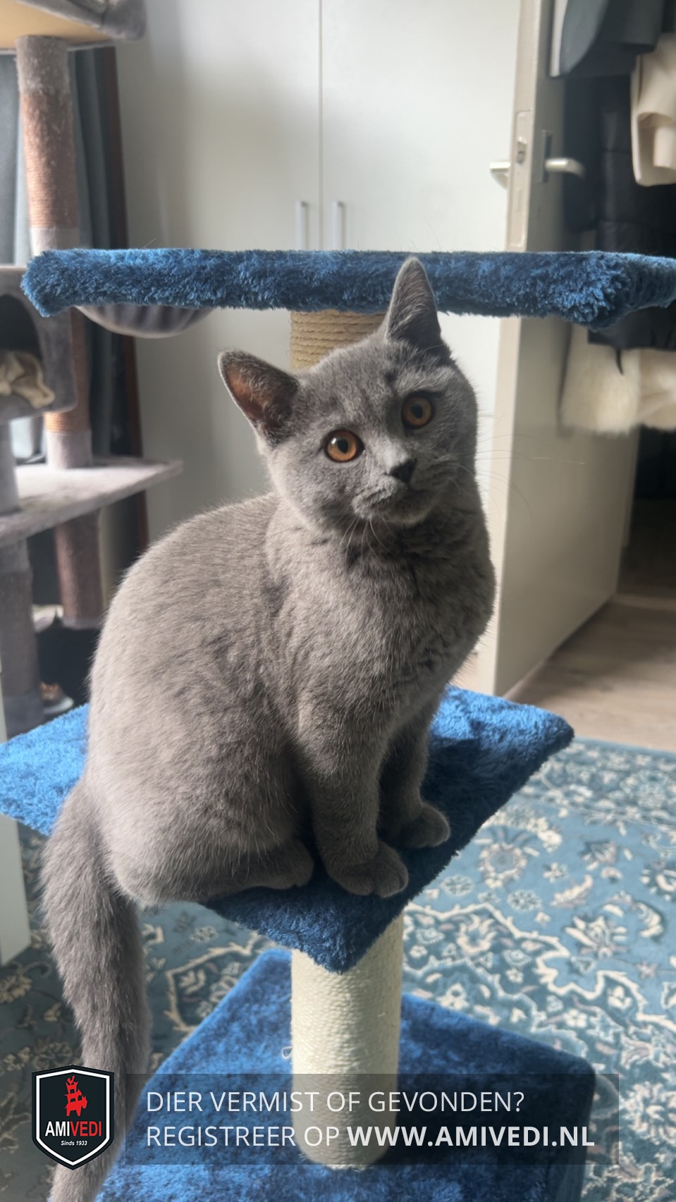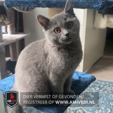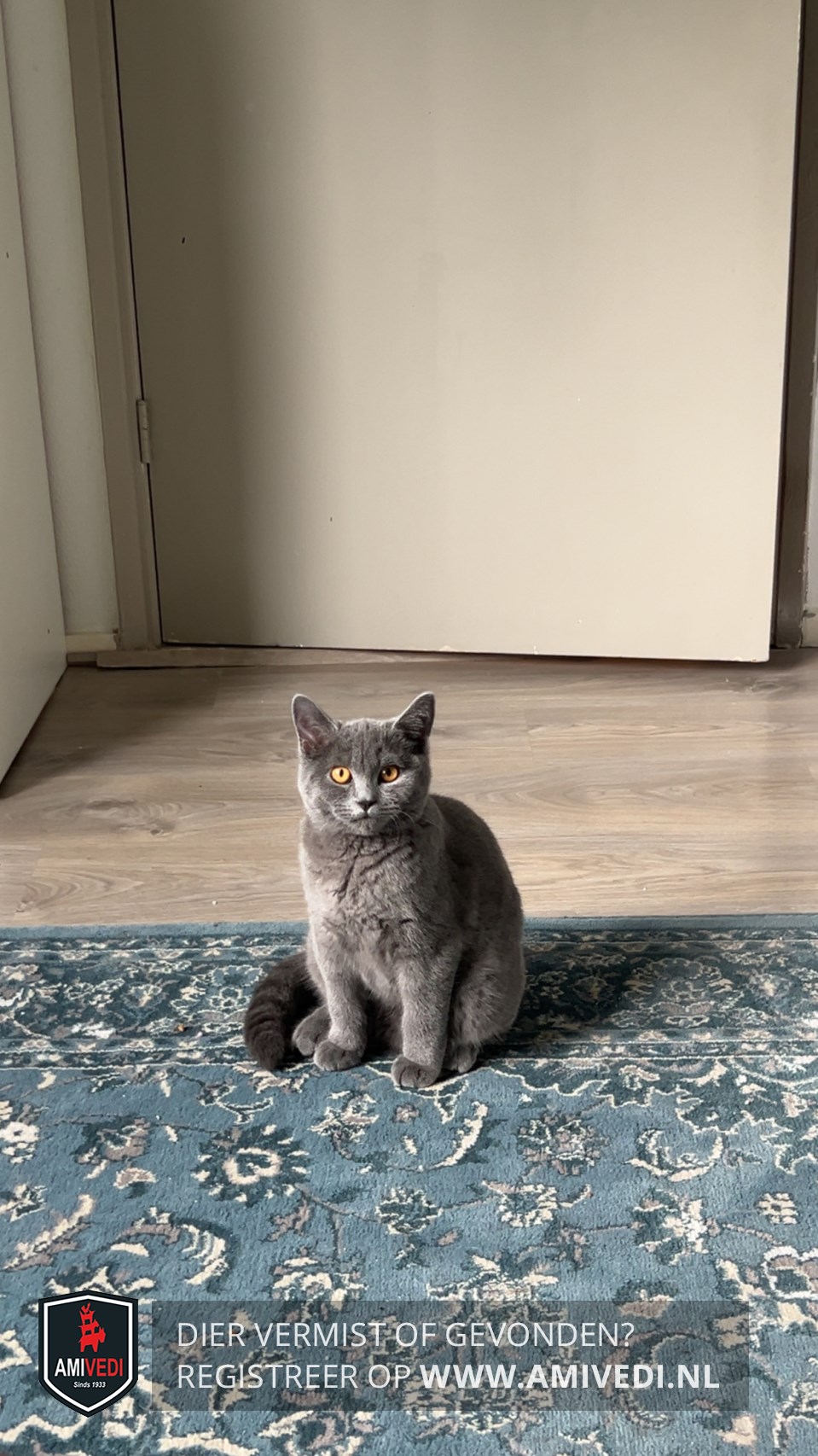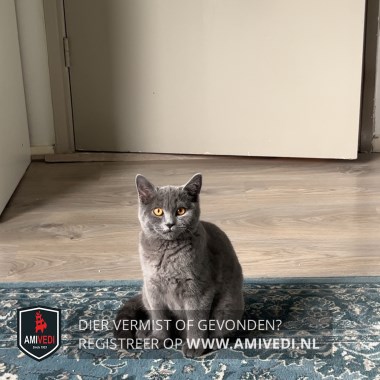 | Signalement | Grijs. Amberkleurige ogen. Staart donkerder grijs. Kleine kat. |
