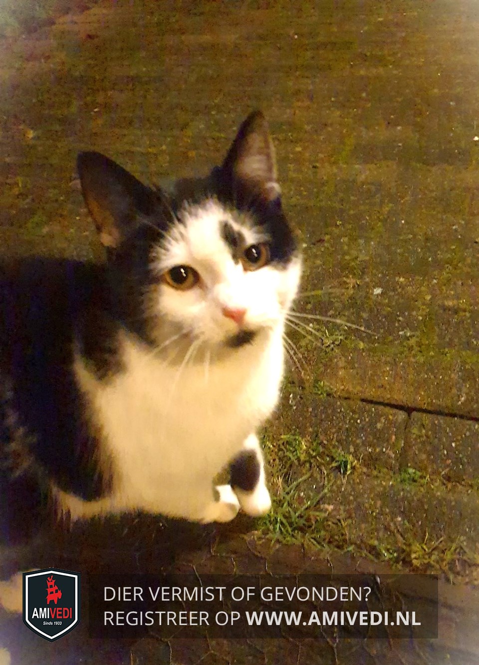 | Signalement | Zwart met een wit snoetje, zwart op het kopje, vlek bij het oog, zwarte kin. Witte borst, buik en witte poten met zwarte vlek voor. Zwarte rug. |