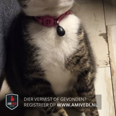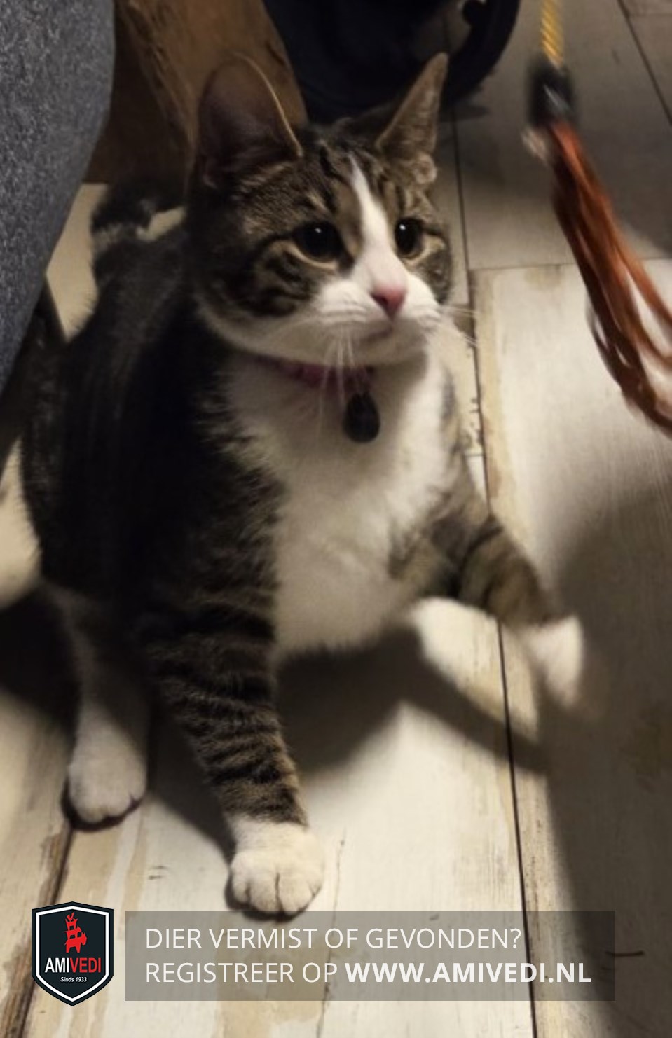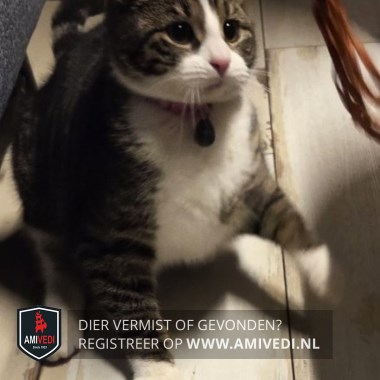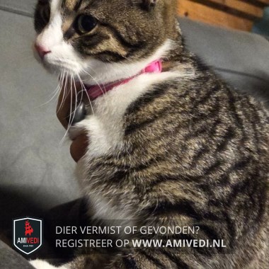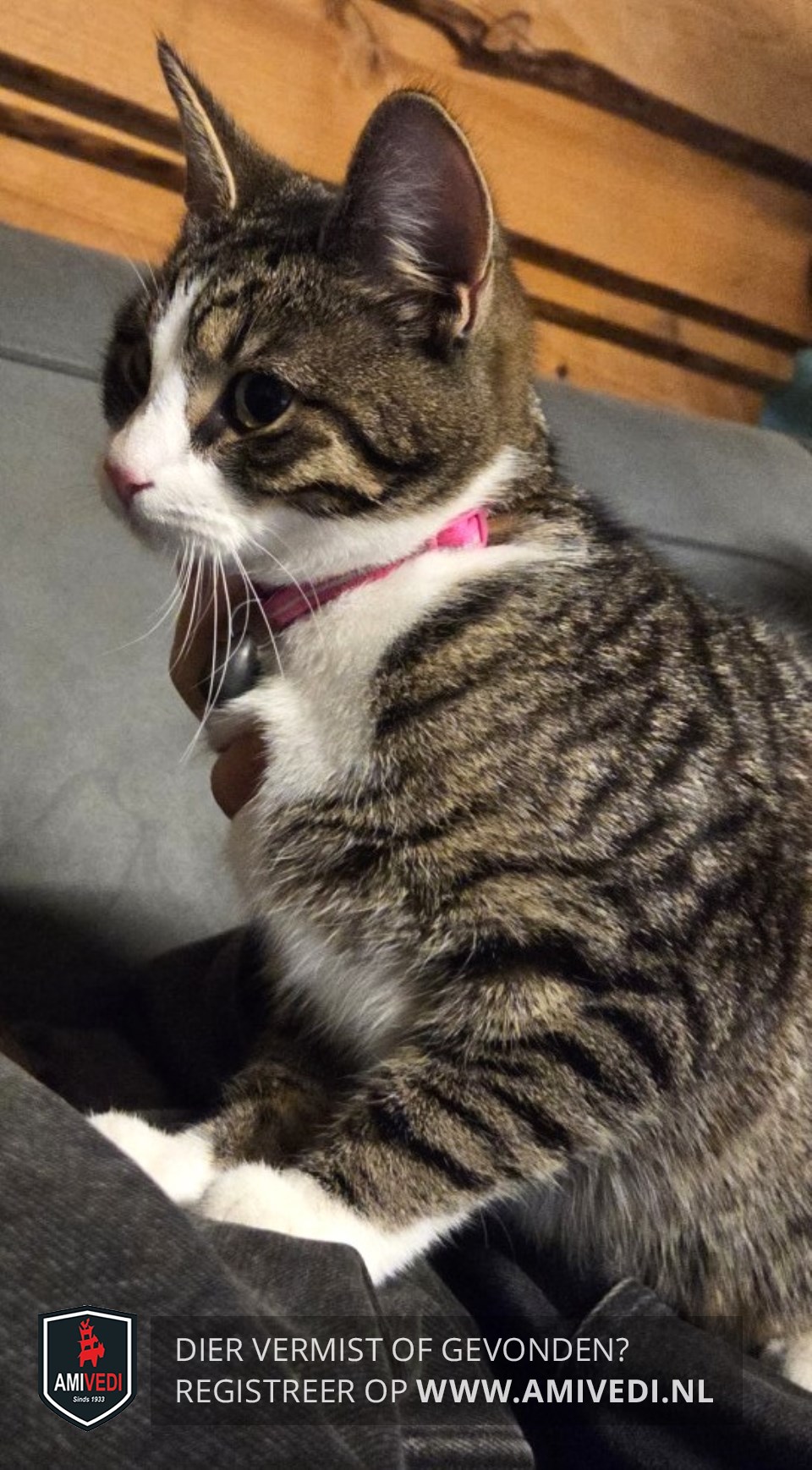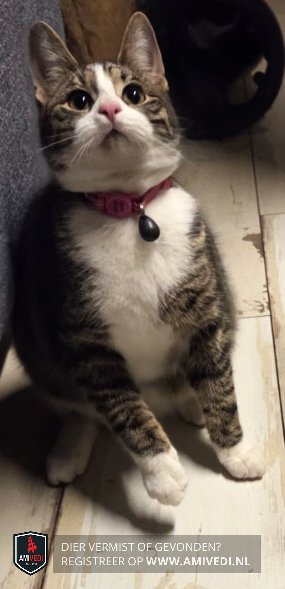 | Signalement | Cypers bruinzwart gestreept met wit. Voornamelijk cypers bruin, tussen de ogen een smalle puntige streep doorlopend over de neusbrug en neus, roze neusje, witte snoet, kin, hals borst wit doorlopend naar nek en helemaal over de onderkant en buik, voorpoten witte sokken, achterpoten witte kousen, staart cypers geringd met een zwarte staartpunt. Draagt een roze halsbandje met sensor! |