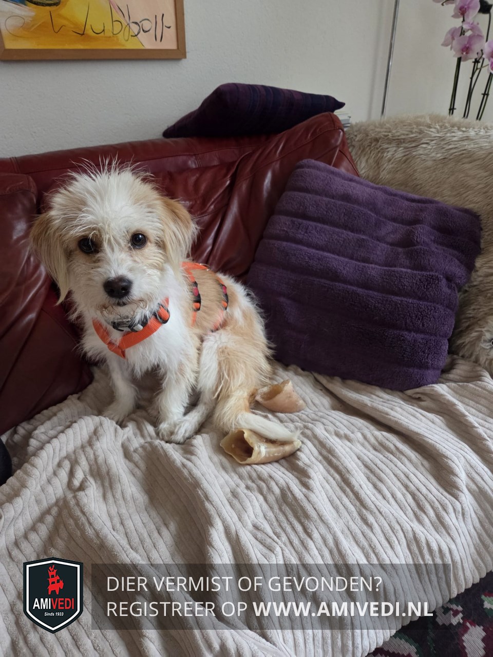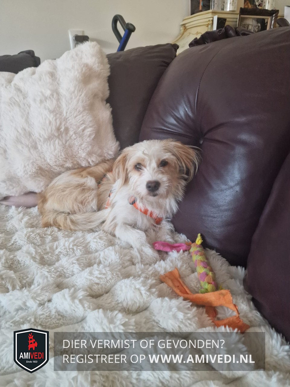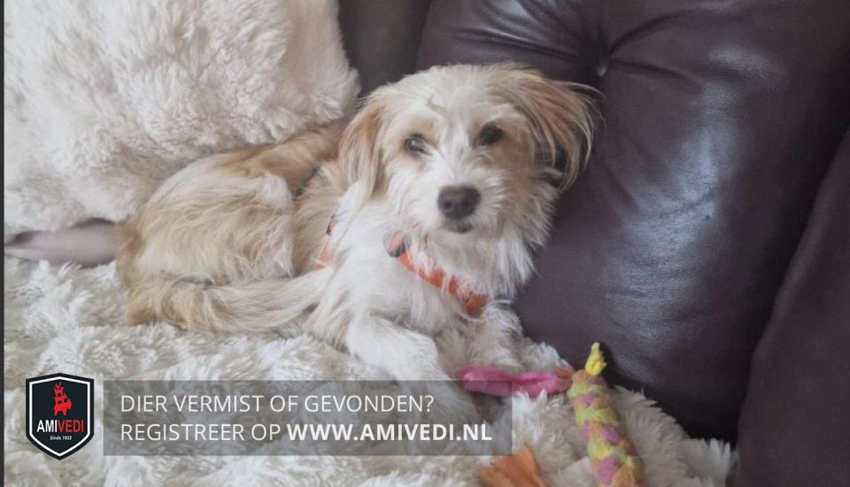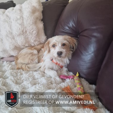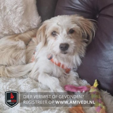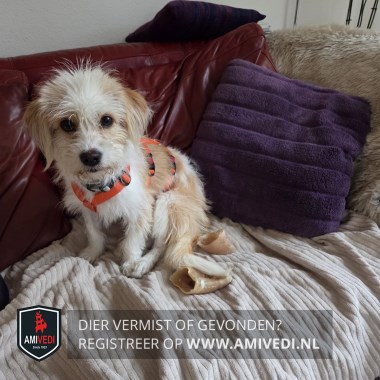 | Signalement | Wit/bruin-beige Boomer hondje. Witte snoet, bef en borst. Bruine hangende oren. Witte voorpoten. Rug is wit/bruin. Hond is niet bekend met zijn omgeving. (Chip staat nog op vorige eigenaar). |