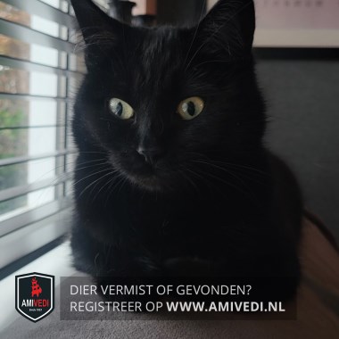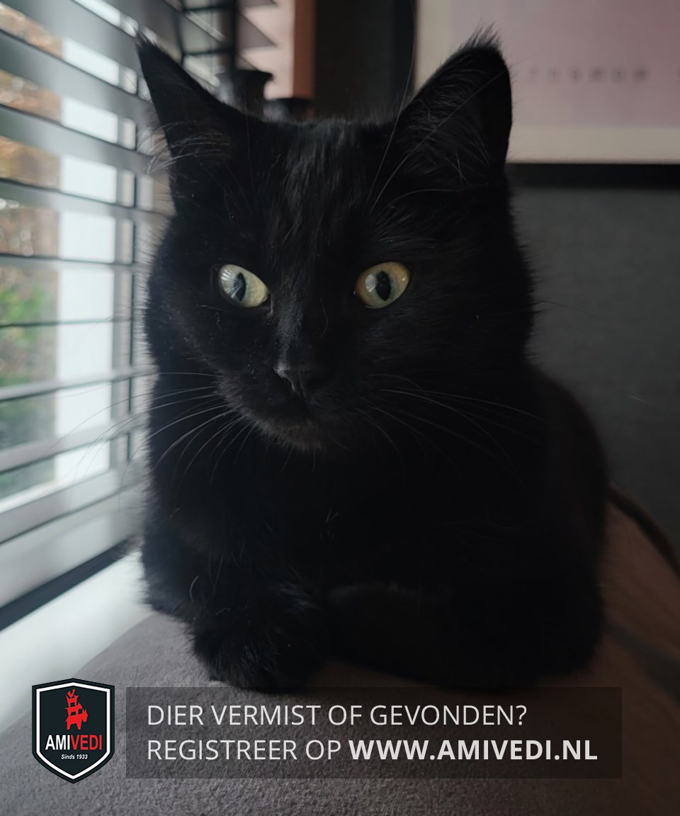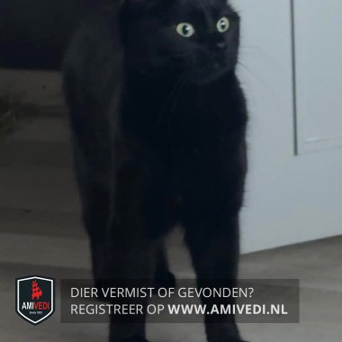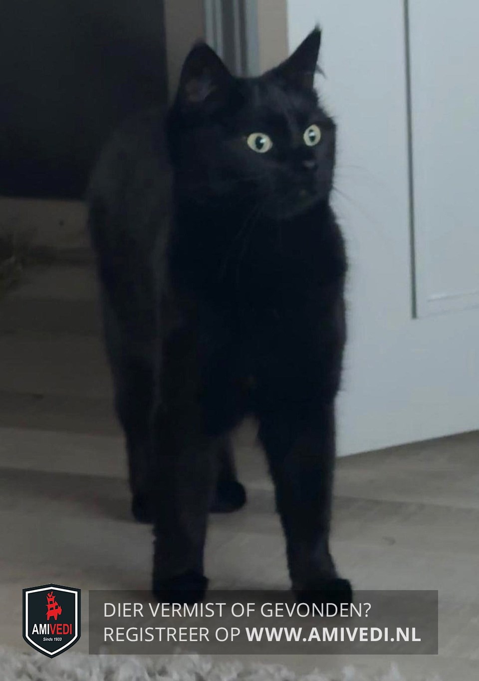 | Signalement | Geheel zwarte poes. Klein/middelgroot, slank, fijn gezichtje. Paar lichte haren in beide oren, licht gele ogen. |