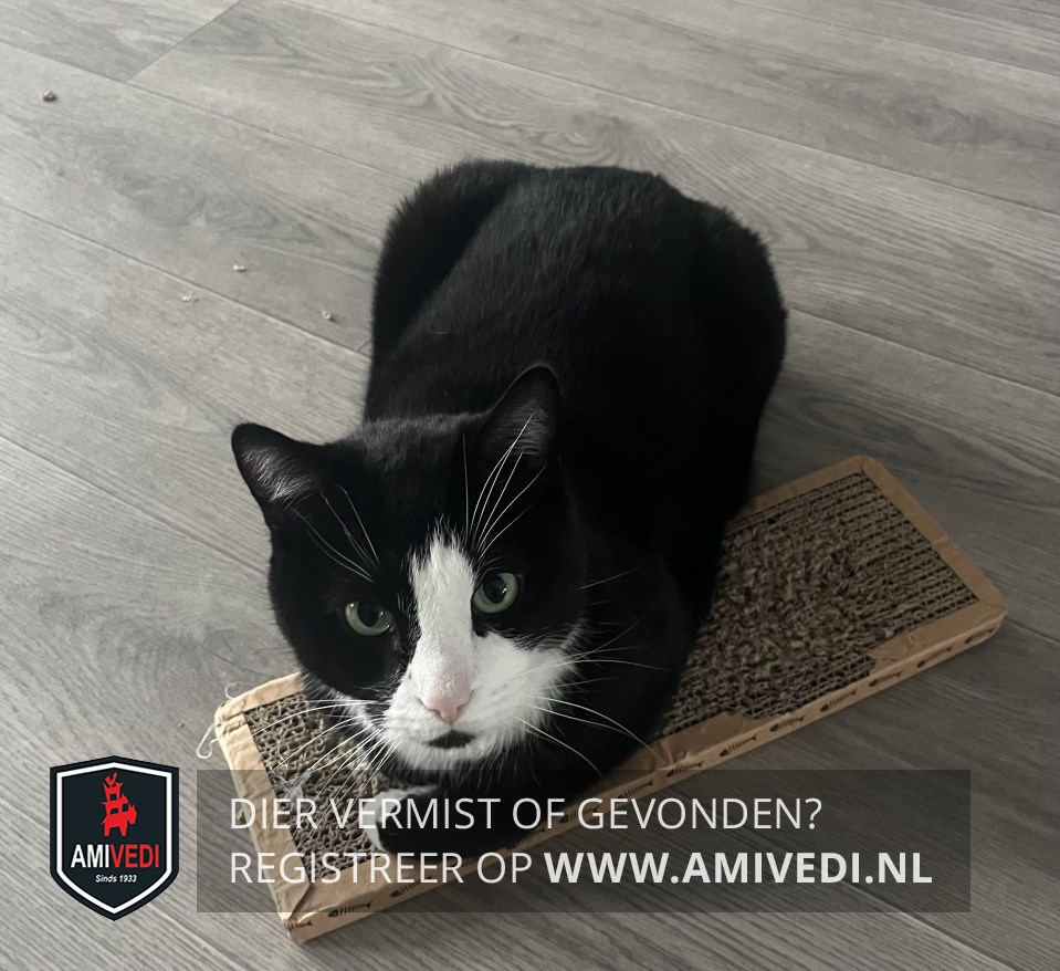 | Signalement | Zwart met witte bles en znuit, zwarte vlek op kin, witte bef, witte voetjes voorpoten. |