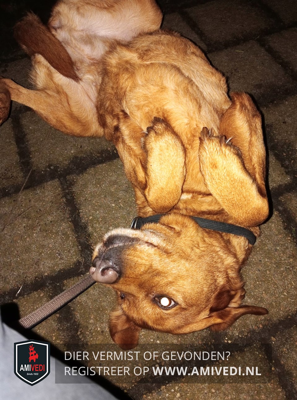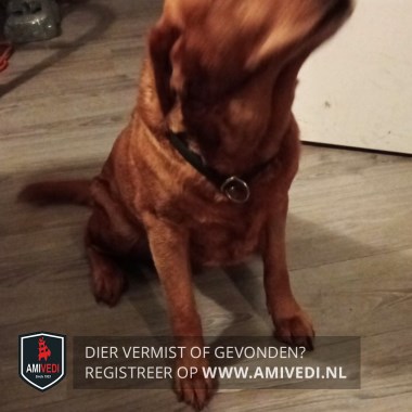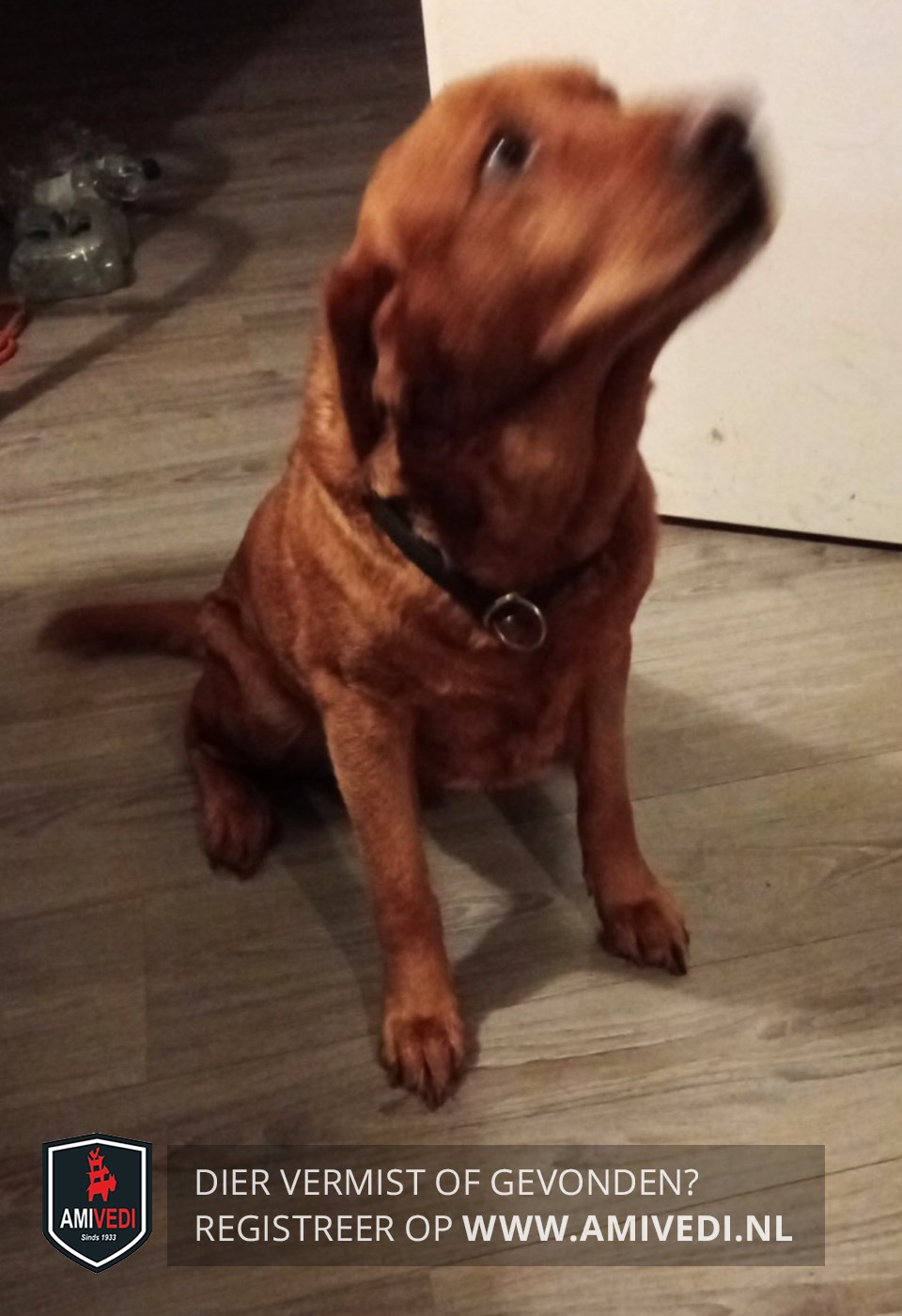 | Signalement | Rood/bruin. Geheel egaal roodbruin. Draagt een zwarte wurghalsband. Labrador Retriever. |