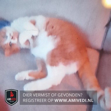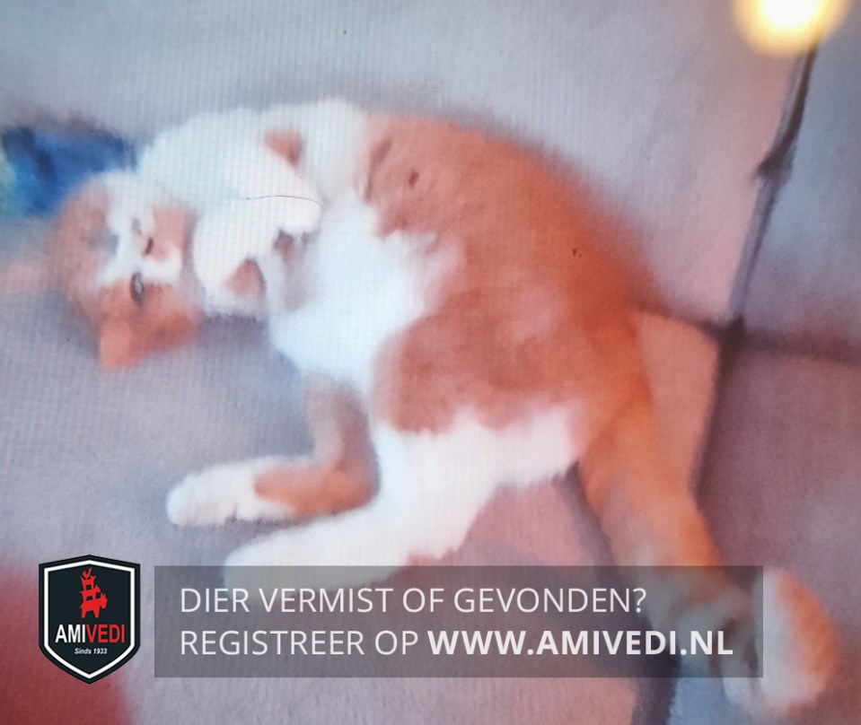 | Signalement | Cypers rood gestreept met wit. Witte snoet met een klein rood vlekje links naast de neus, rood vlekje onder de neus rechts, rood kinnetje, rood vlekje op de linker wang onder aan de kaaklijn, rood kinnetje, witte borst, rode vlek in de oksel van de linker voorpoot, witte voorpoot links, rechts een witte voorpoot met een rode vlek op de achterzijde van de poot, witte buik, witte hoge sok die iets omhoogloopt langs de achterzijde bil en een rode vlek op de hak links achter en een rood sokje links achter. |