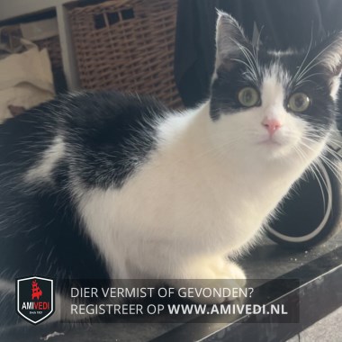 | Signalement | Wit met zwart voor de oortjes. Zwart rondom en naast de oogjes. Zwart op de rug. Zwarte vlek op de rechter zijkant van het lijfje. Zwart op de rechterheup. |