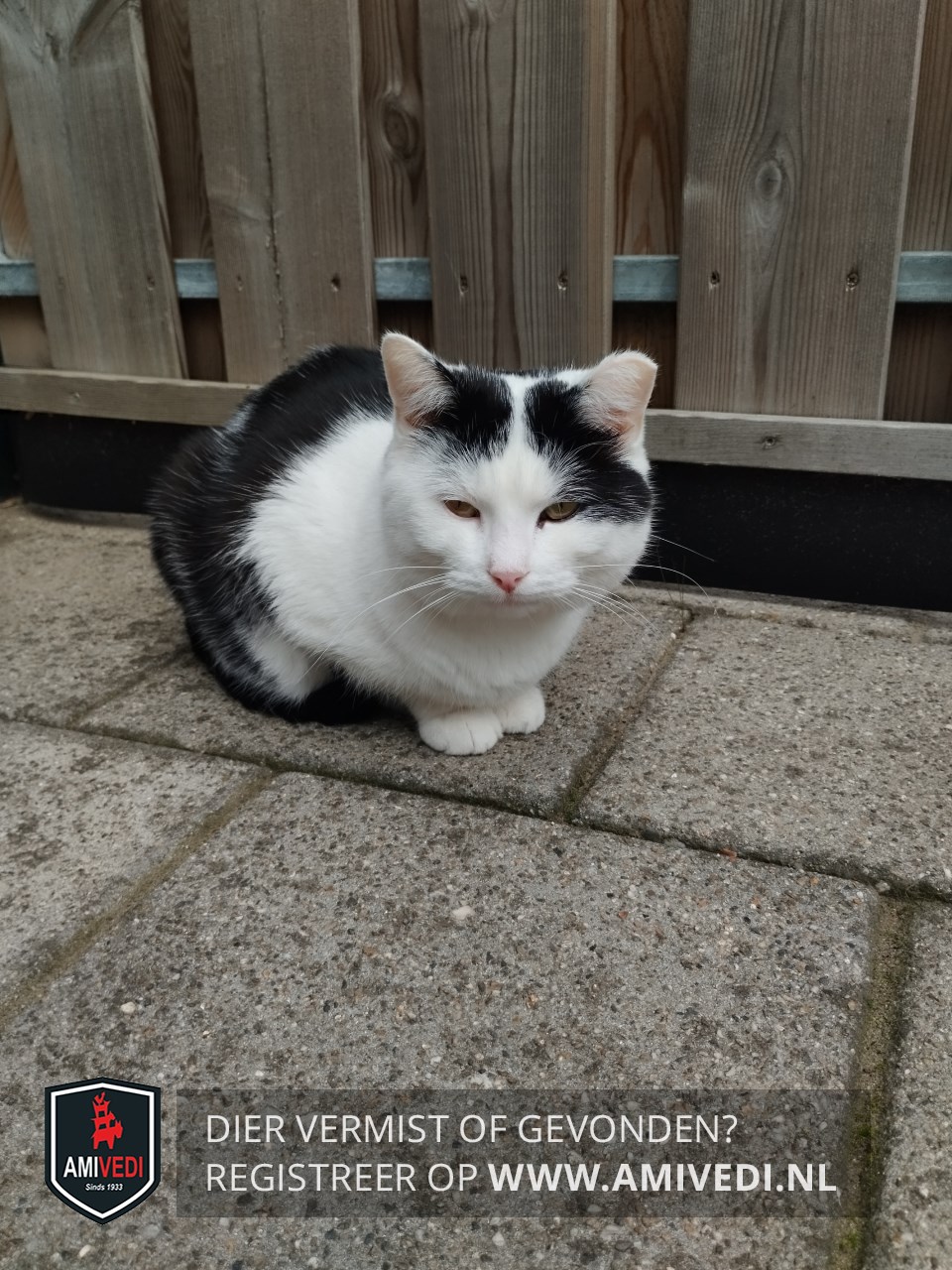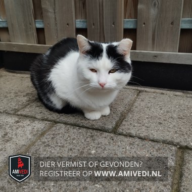 | Signalement | Wit met zwart naast rechter oor zwart naast linker oog en oor, linker oor knipje af, zwart gevlekt op rug en zwarte staart. |