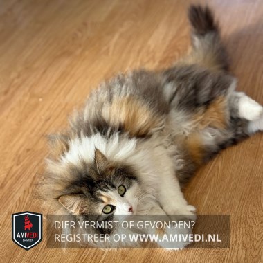 | Signalement | Grijs-wit-zwart-oranje gevlekte Noorse boskat. Witte pootjes, zwart-grijze staart en een grote witte 'kraag'. Kopje boven en naast oogjes cypers grijs met rood vlekje boven rechteroogje. Witte bles en neus. Wit rondom mondje .Witte kin, borst, buik en pootjes. Rood vlekje op rechter voorpootje. |