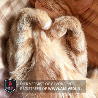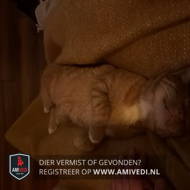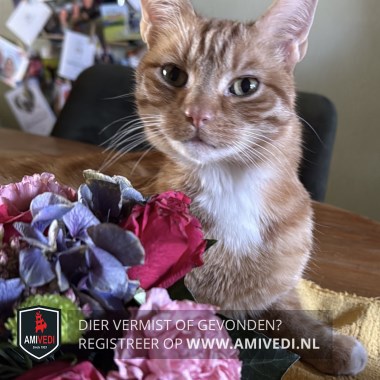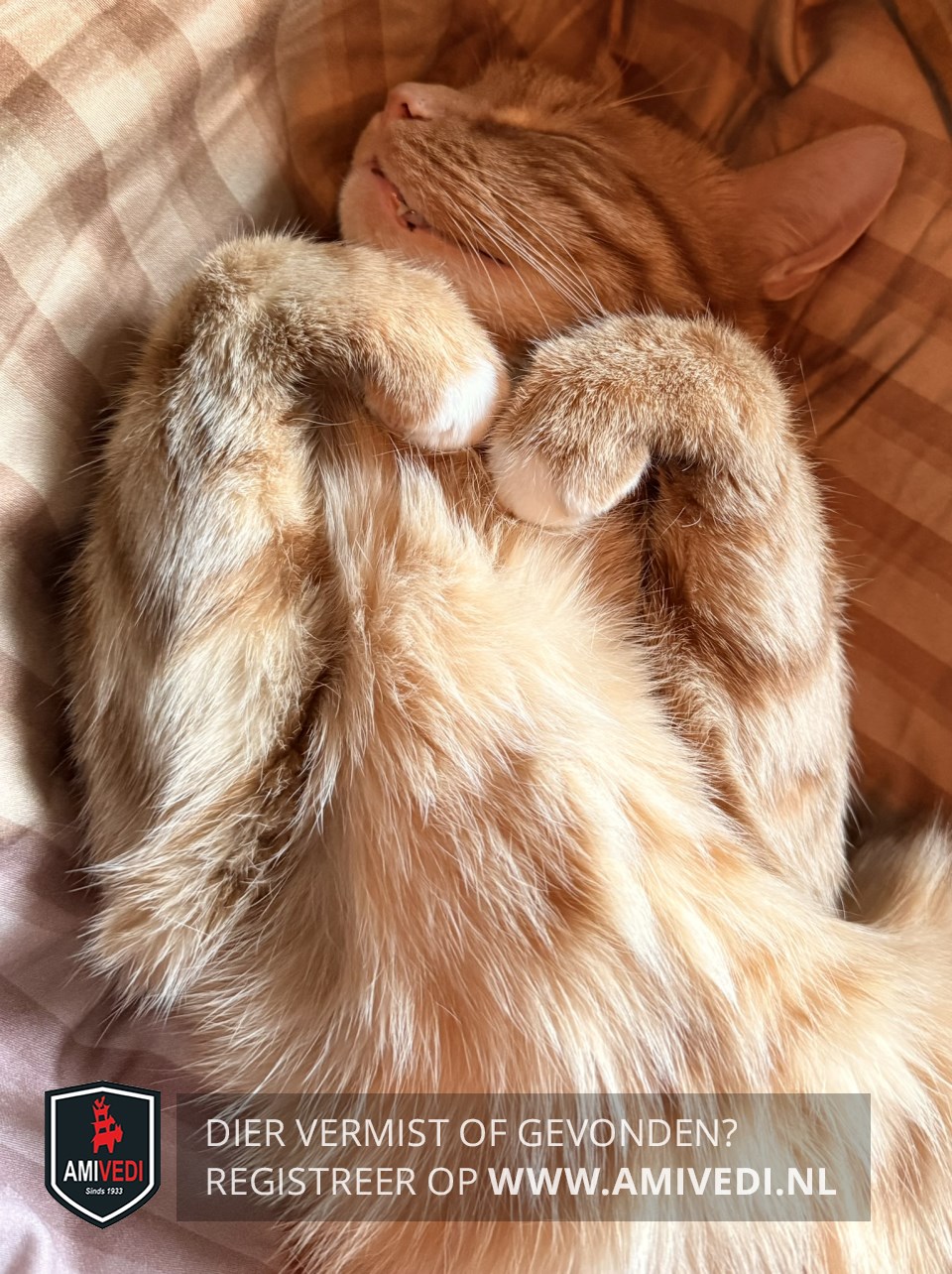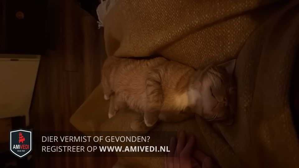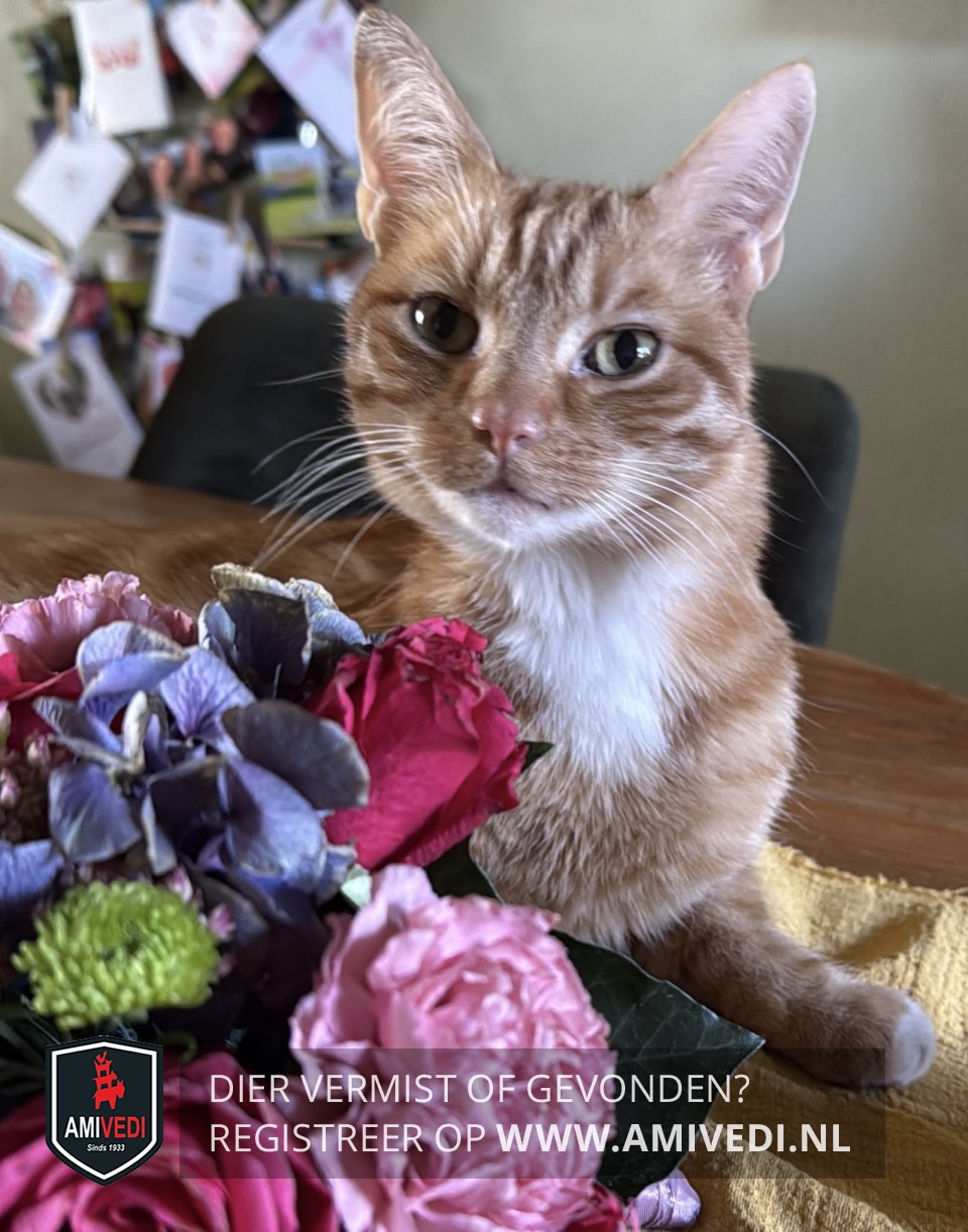 | Signalement | Cyperse rood/oranje kater. Wit kinnetje en witte bef. Witte teentjes. Ontsteking op linkerwang, die al enigszins aan het genezen is. |