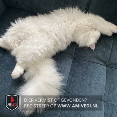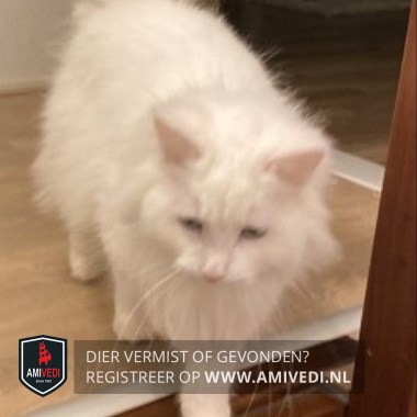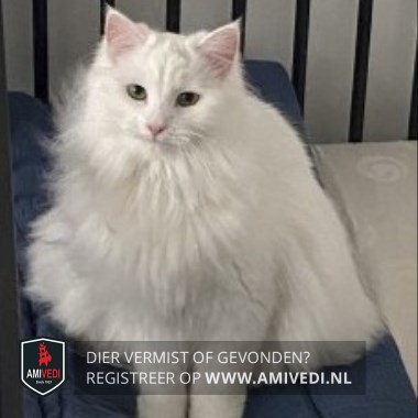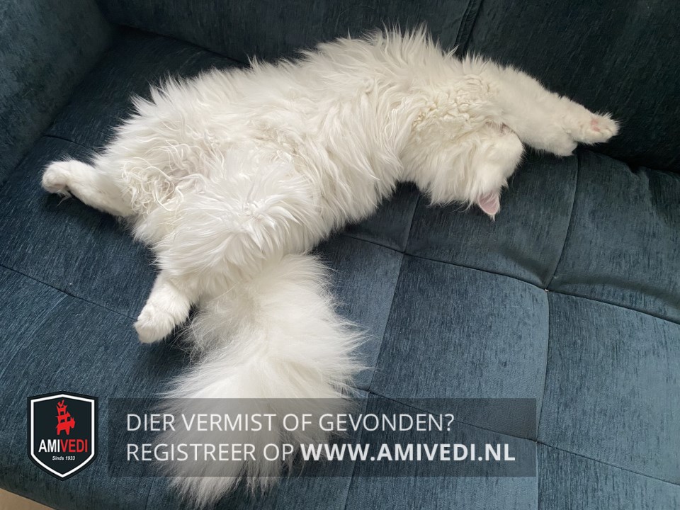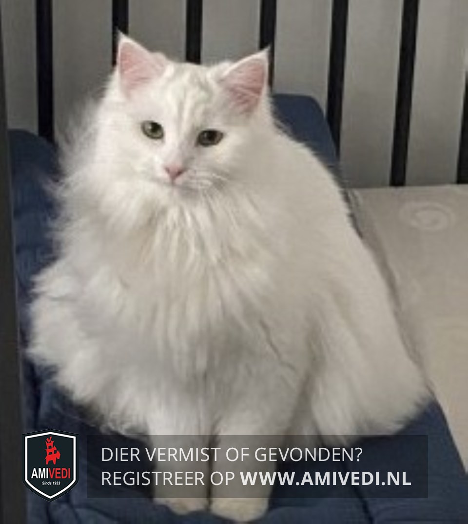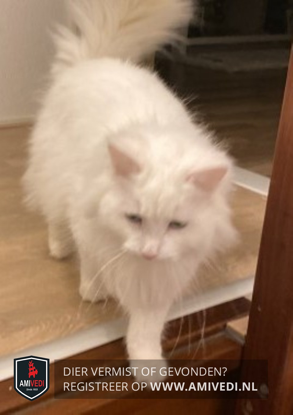 | Signalement | Witte schuwe kat met lang dik haar en een pluimstaart. |