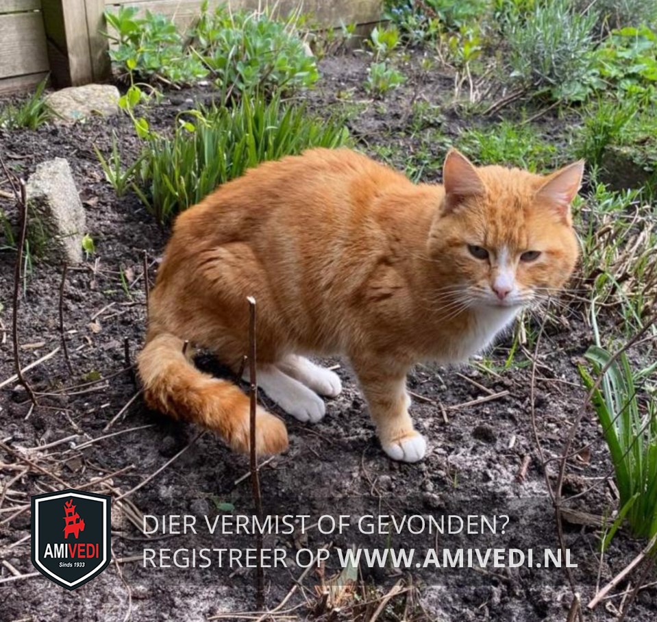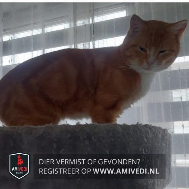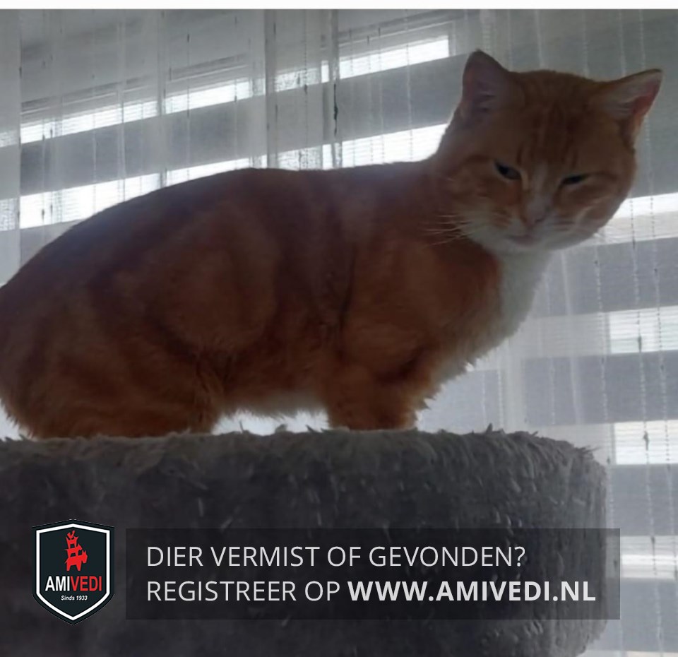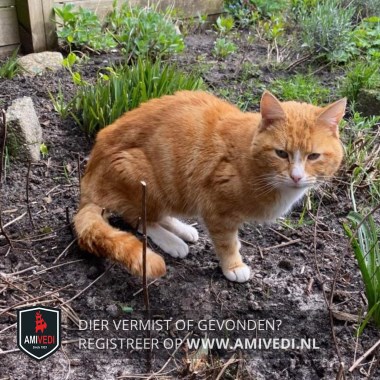 | Signalement | Rood/ oranje gemarmerd met wit. Wit snuit met wit streepje tussen de ogen. Witte kin, hals, bef. Tenen voorpootjes wit, sokken achterpootjes wit. Draagt een geel halsbandje. Aanhankelijk en luistert goed naar zijn naam. |